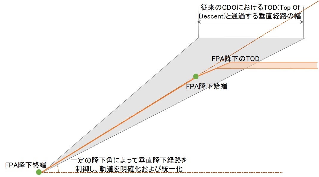 降下時の燃費改善手法として、航空機が巡航の降下開始点から継続的に降下するCDO (Continuous Descent Operation、以下、CDO)が既に運用されていますが、CDOは到着便が降下時に機体重量・風・気温、機種特性などを基に計算した最も燃料効率の良い垂直経路で降下することから、一便毎に降下軌道が異なります。このことからCDOは管制官の指示による従来の降下方式と比べ燃料削減効果は高いものの、安全確保のため関西国際空港など、3空港の夜間・早朝の輻湊機の少ない時間帯に限り導入されており、実施数は限定的に留まっています。