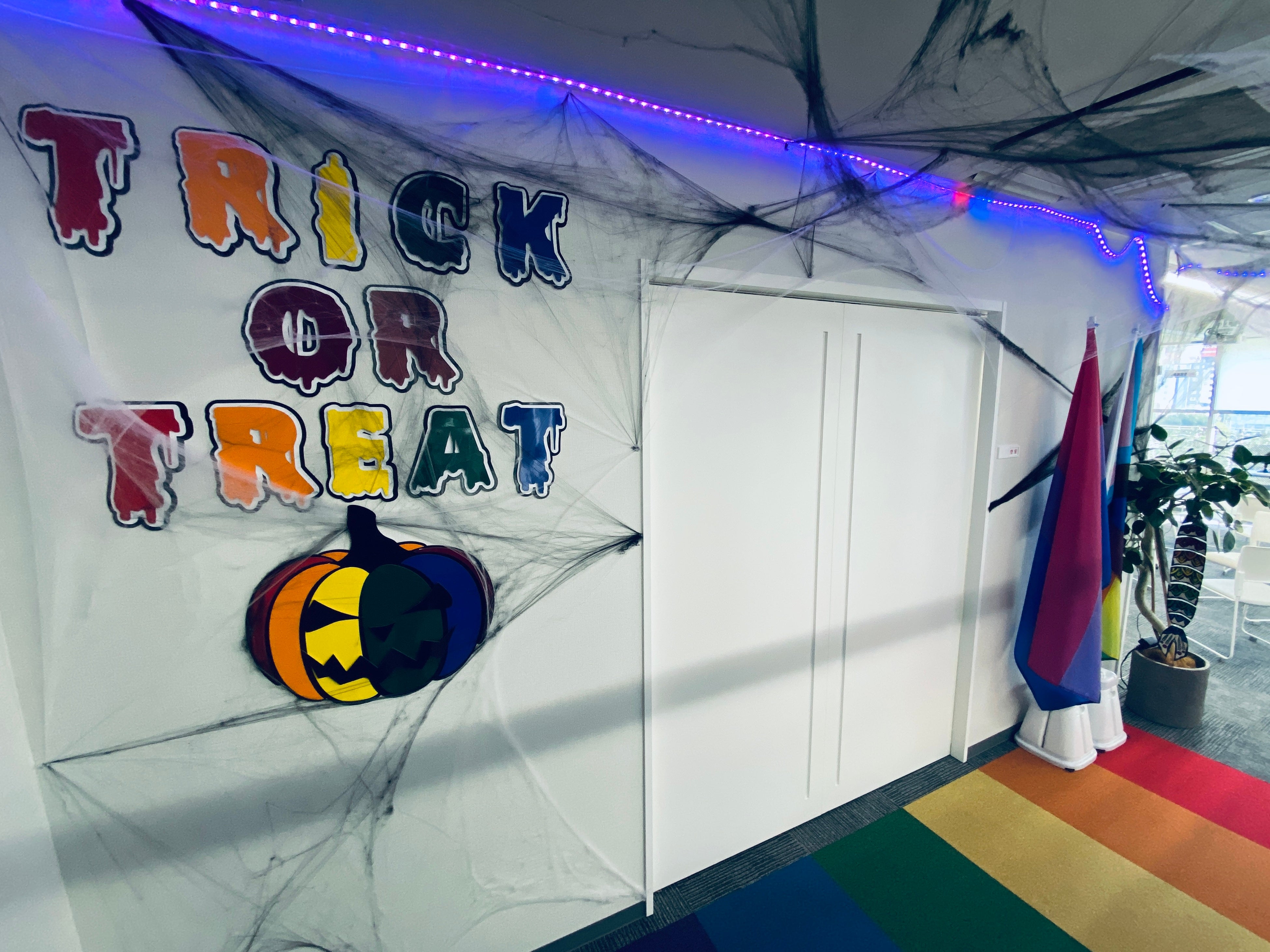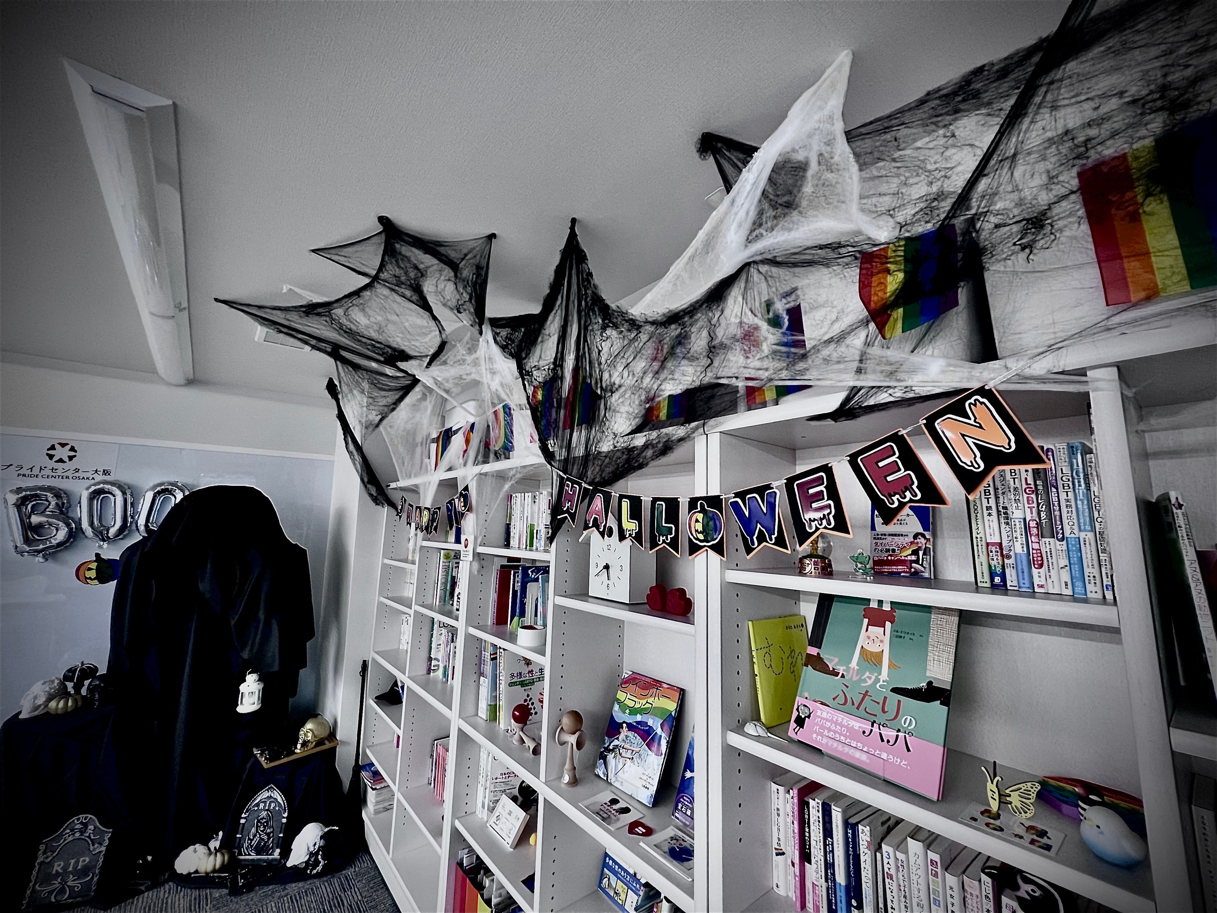 「LGBTQ等の性的マイノリティとその家族、アライの尊厳と権利を守り、誰ひとり取り残さない社会の実現をめざす」ことをミッションにしている認定NPO法人虹色ダイバーシティ(所在地:大阪市北区、理事長:村木 真紀)は、大阪の天満橋にある常設LGBTQセンター「プライドセンター大阪」のオープンスペースを期間限定(9月26日〜10月31日)でハロウィン仕様にデコレーションしました。