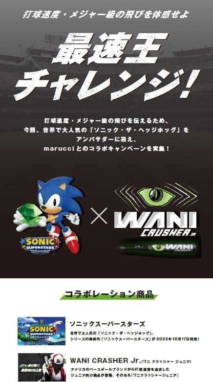 セガより10月17日に発売されるシリーズ最新作『ソニックスーパースターズ』と、米ベースボールブランドmarucci(マルチ)が開発したバット「ワニクラッシャージュニア」の“速さ”を追求したコラボレーションがこのたび実現しました。