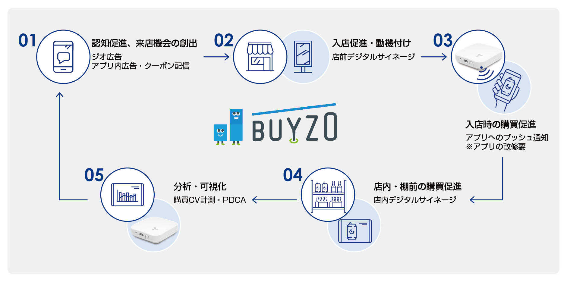 ※2 BUYZO Mediaは、グローリーが有するお客さまのスマートフォンのGPS位置情報やAIBeacon(※4)その他