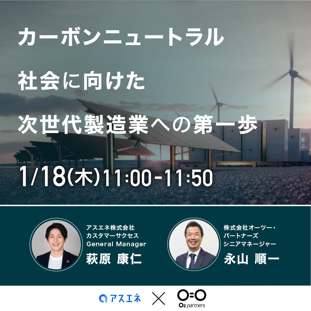CO2排出量見える化サービスのリーディングカンパニー アスエネ株式会社と製造業向け業務改革DXコンサルティングの株式会社オーツー・パートナーズが共催するウェビナーのご案内です。このウェビナーは、製造業が直面するカーボンニュートラルの現状と歩むべき方向性についてのご提案です。下記をテーマに、ソリューションを提供するアスエネ株式会社と当社より、実際の事例を交えてご紹介をさせていただきます。