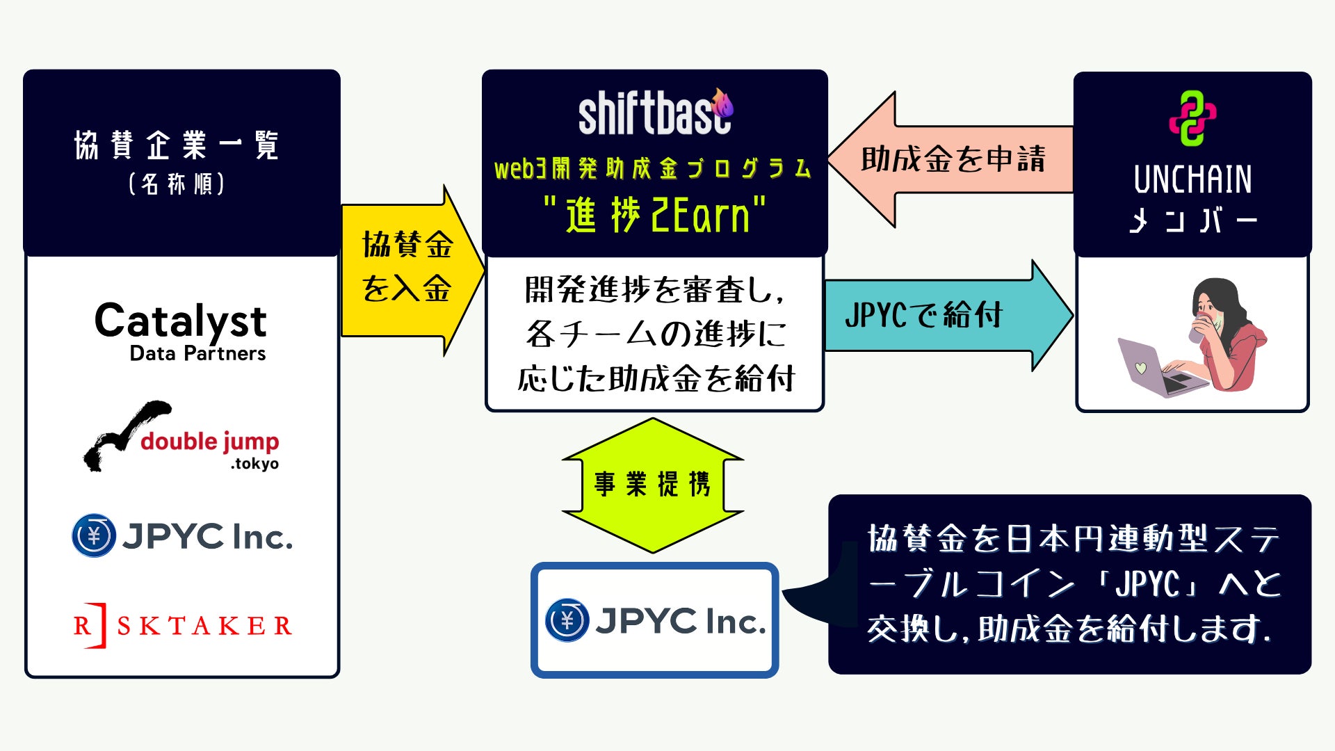 第一回目の本プログラムの予算は、web3エンジニアを採用したい企業及び株式会社shiftbaseから協賛金として3,000万円を準備します。現時点で、株式会社Catalyst・Data・Partners、double jump.tokyo株式会社、JPYC株式会社、株式会社RiskTakerの計4社から協賛金が集まっており、2月末までスポンサーを継続して募集しております。日本円で受領した協賛金は、当社と事業提携を発表した株式会社JPYCが発行する日本円連動型ステーブルコイン「JPYC」へと交換され、助成金(Grant)の申請がおりたUNCHAINメンバーへと即時給付します。