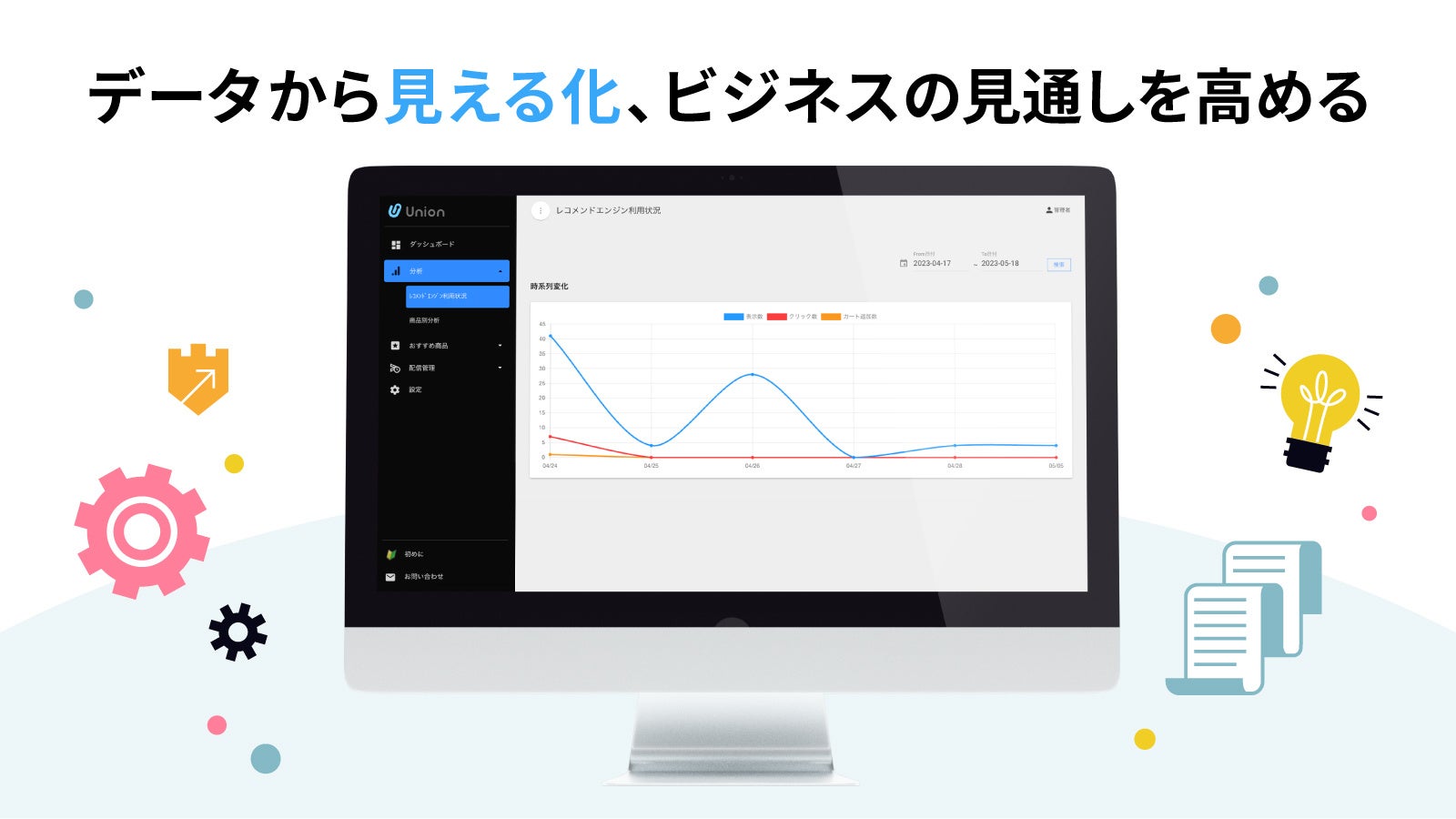『Union』は、購入履歴や在庫情報等のデータ分析に基づいて、パーソナライズされた商品推奨を行う販売支援システムです。精緻なレコメンドを通じて顧客体験の向上とCVRの増加を目指します。
