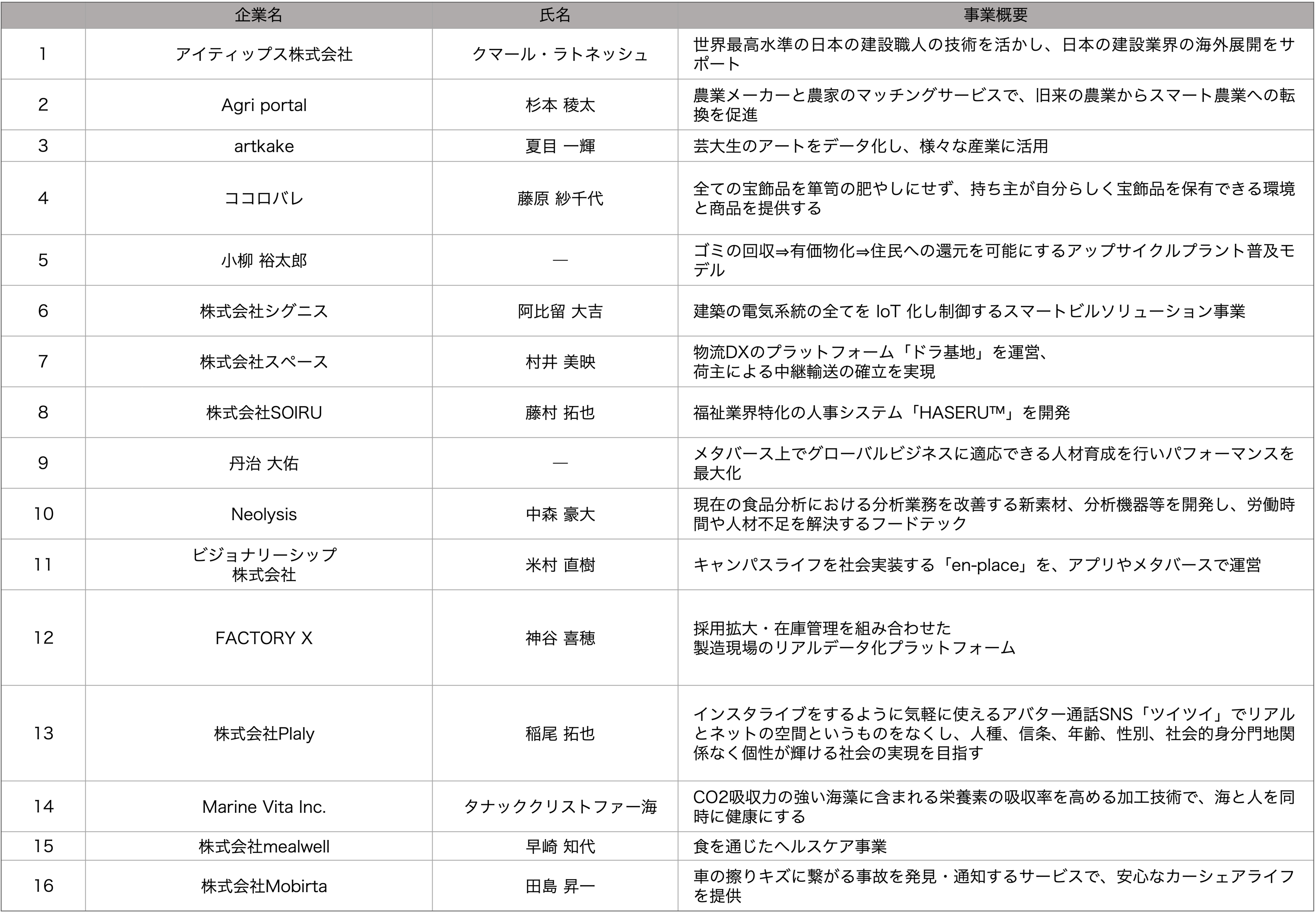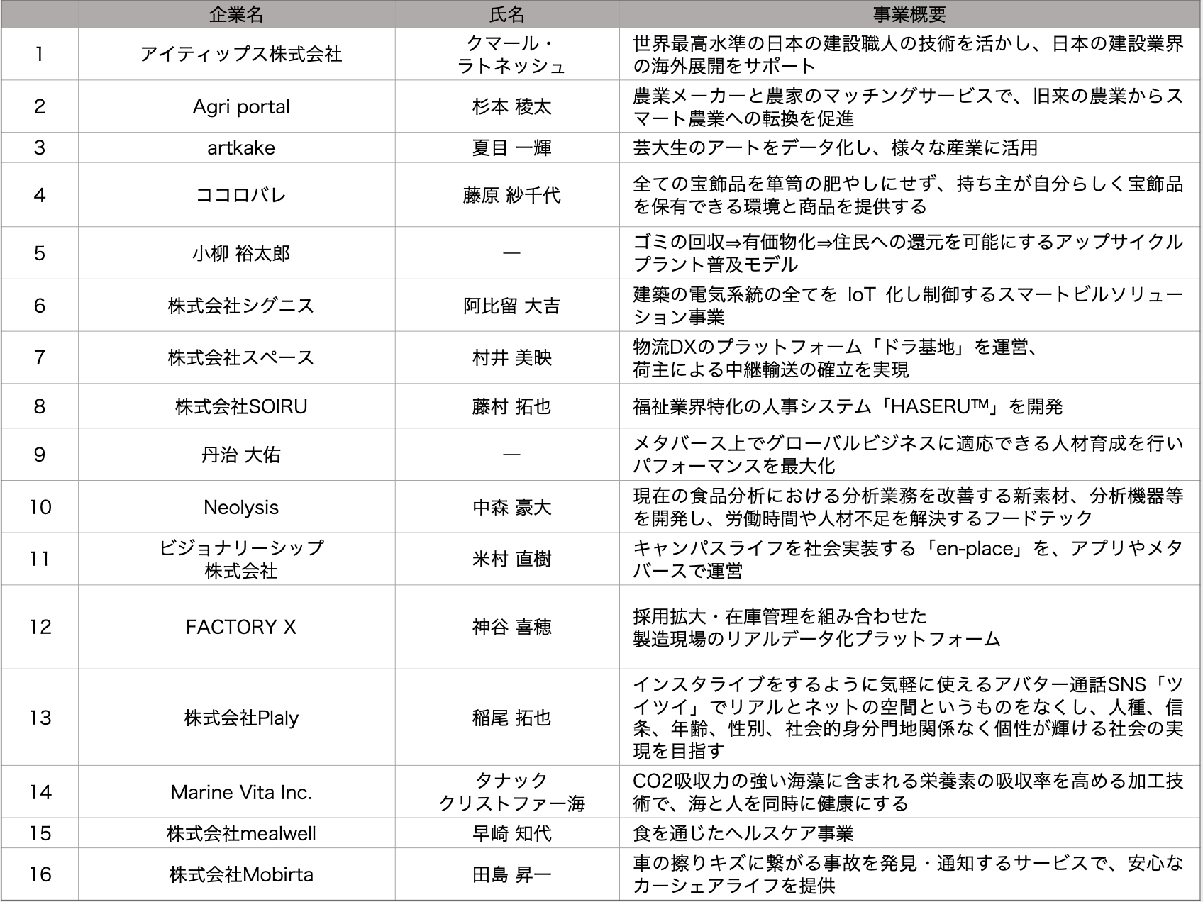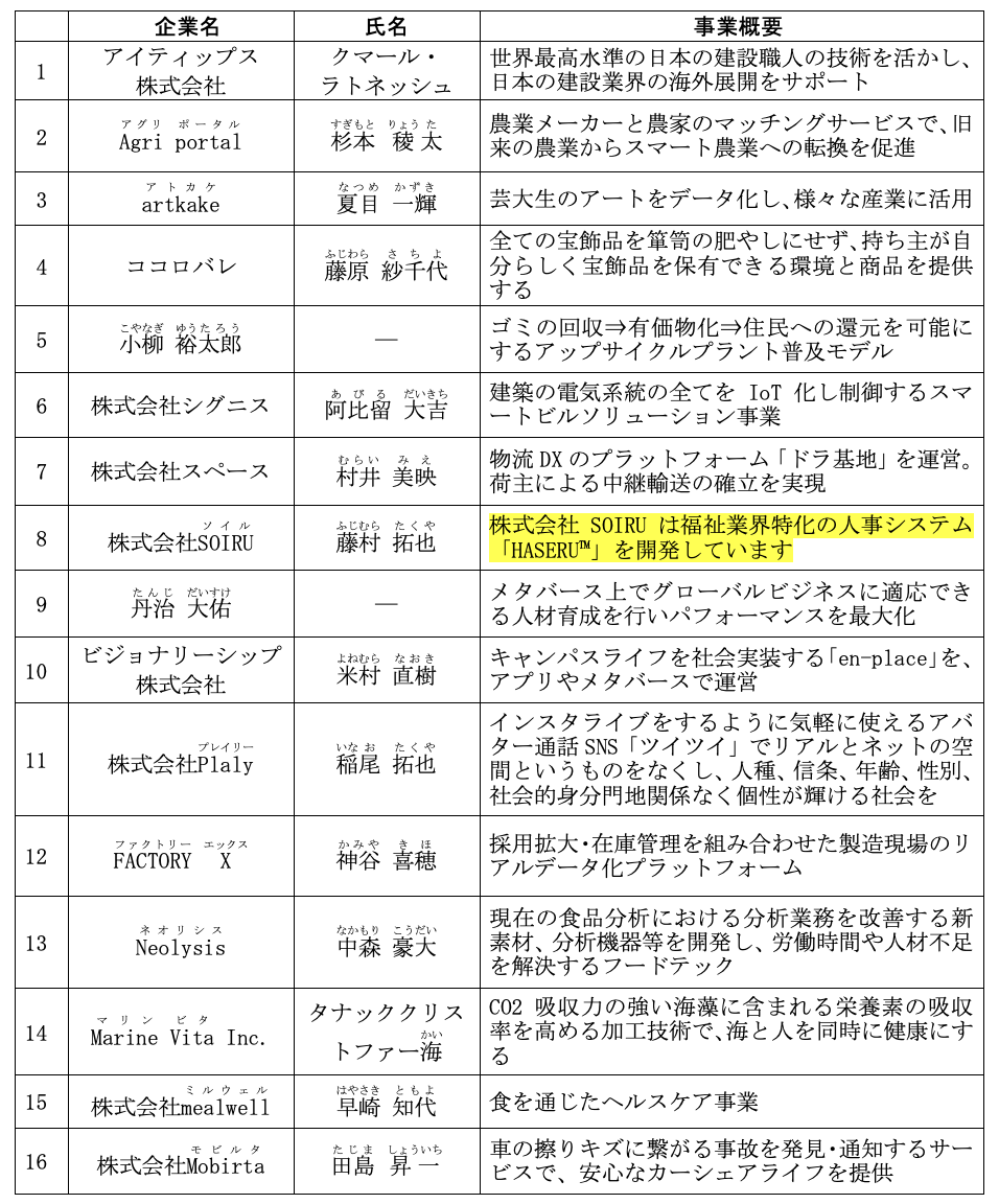 (1) 参加スタートアップ(16社) (五十音順、敬称略)