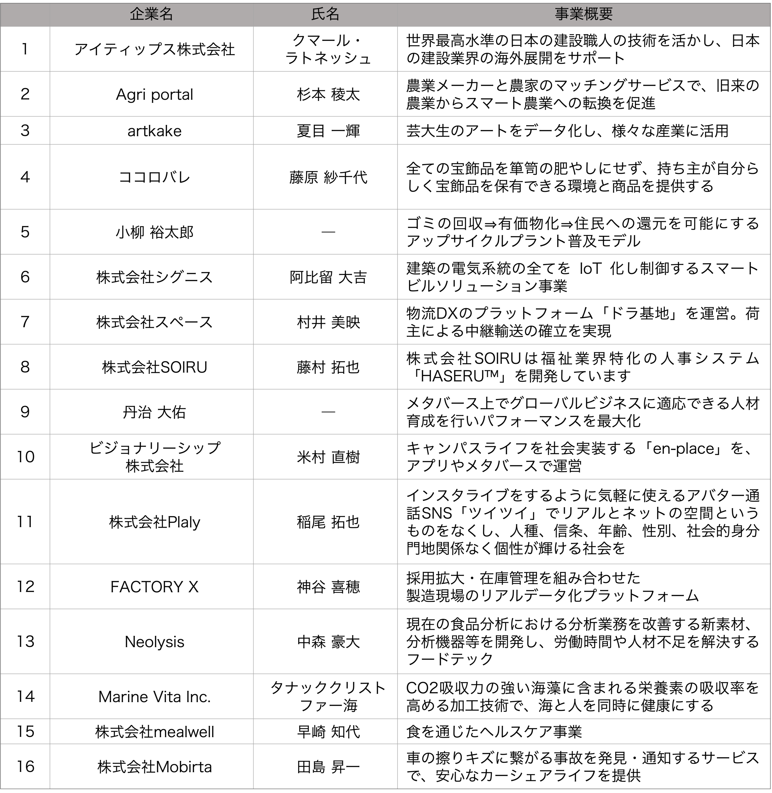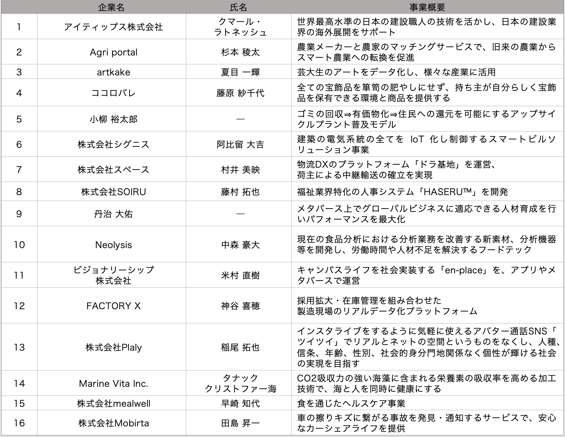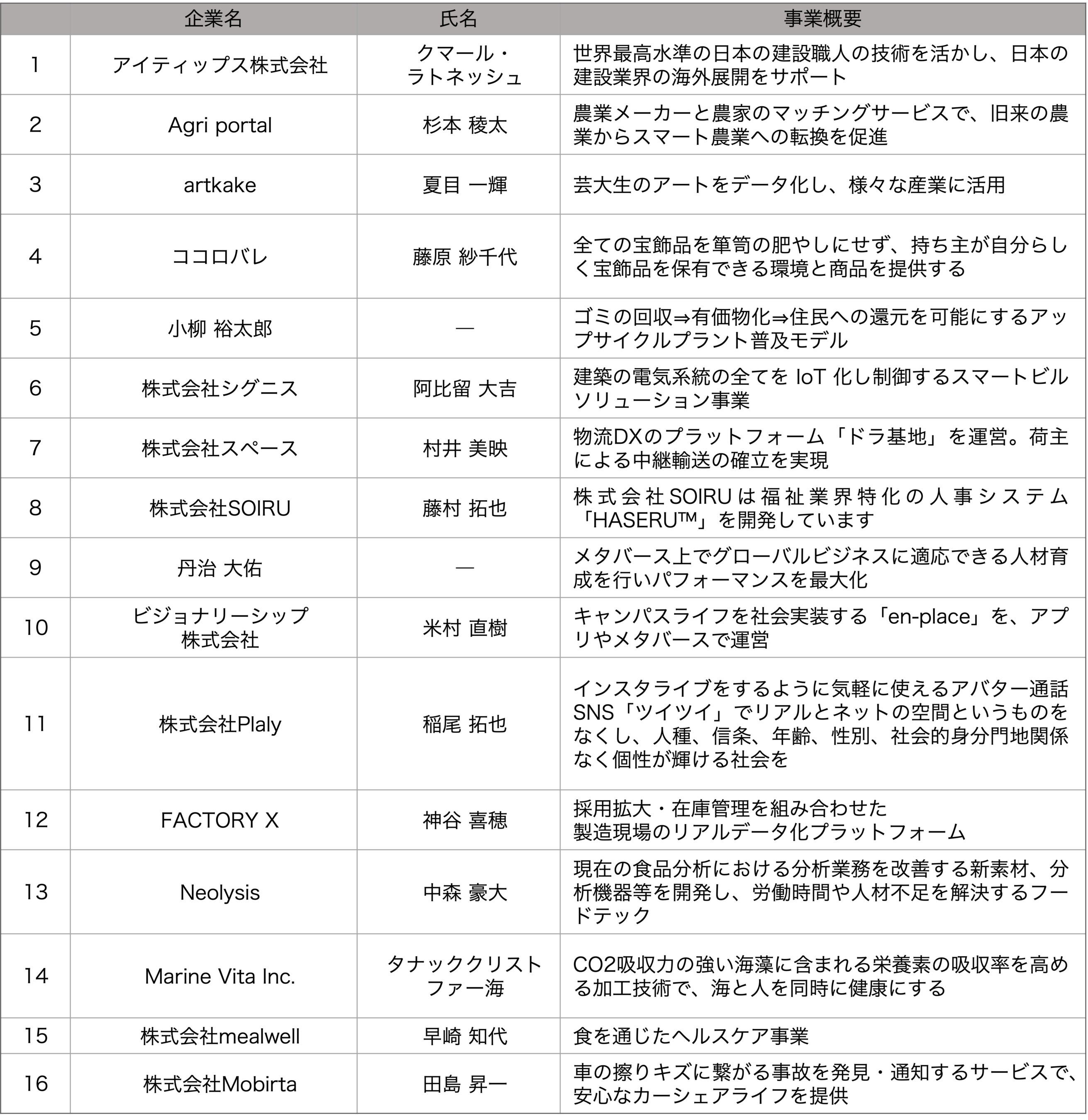 (1) 参加スタートアップ(16社) (五十音順、敬称略)