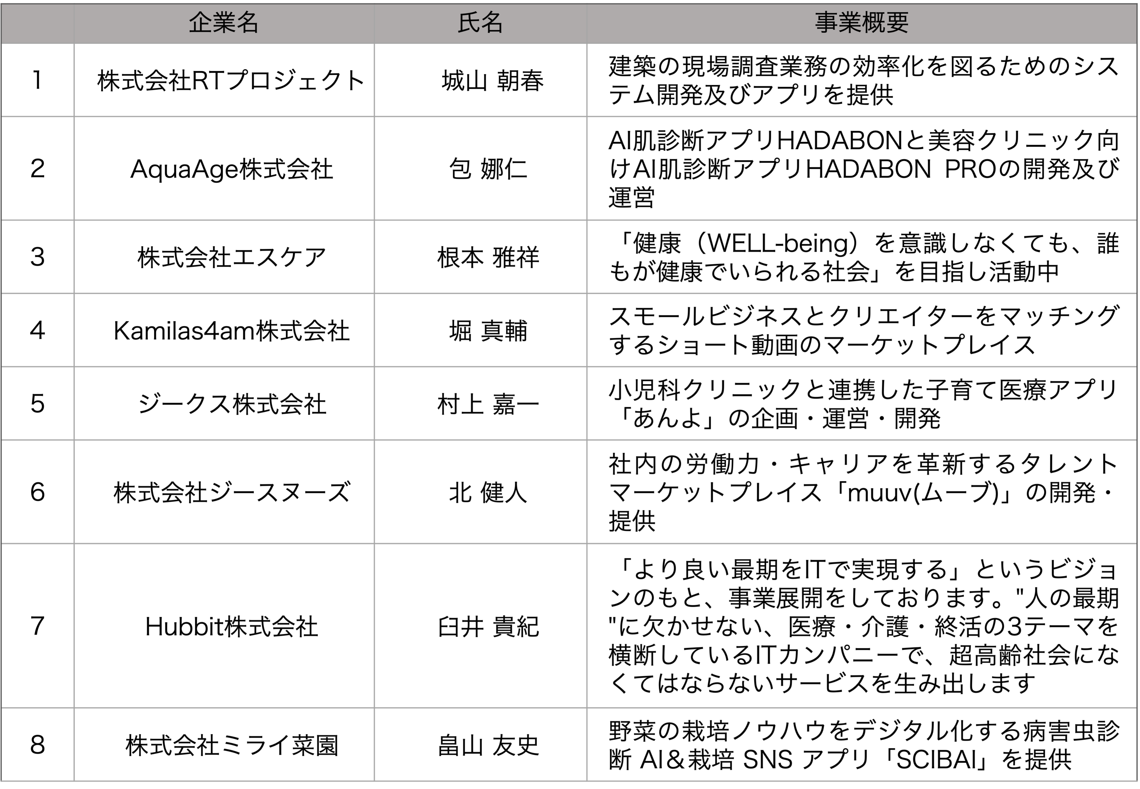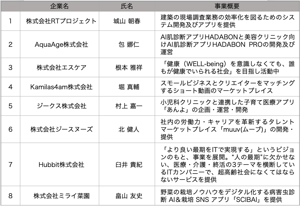 (1) 参加スタートアップ(8社) (五十音順、敬称略)