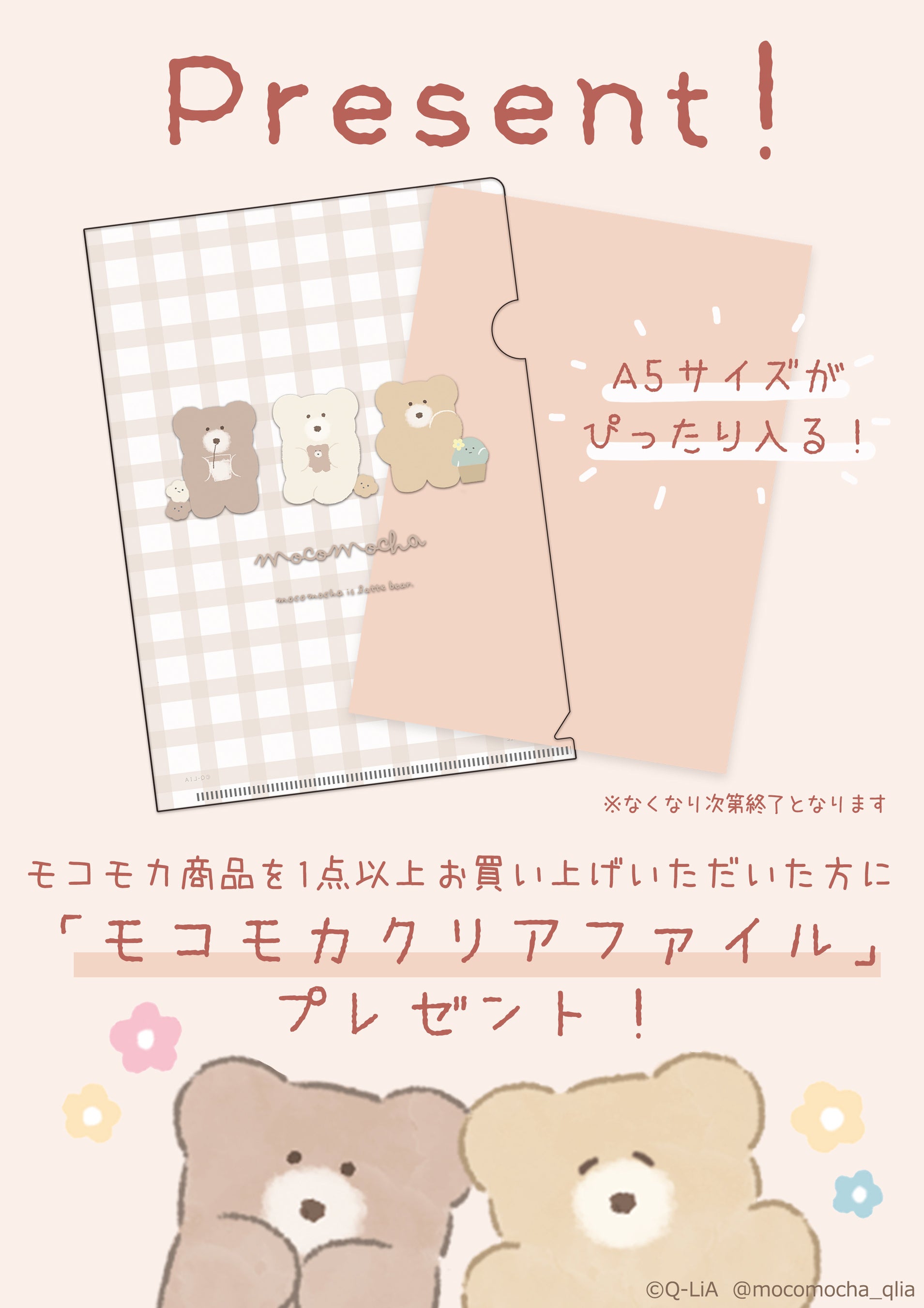 期間中モコモカ商品を1点以上ご購入いただいた方に、ミニクリアファイルをプレゼントするスペシャルキャンペーンを実施いたします。なくなり次第配布終了となりますので、ご注意ください。