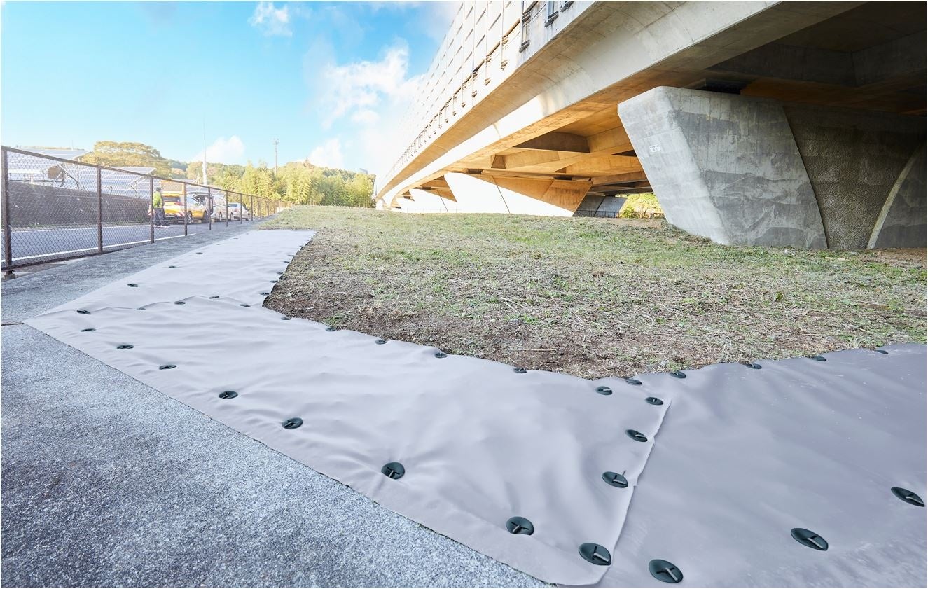 インフラ周辺の法面に課題とされていた二次災害予防や雑草管理について、高齢化による担い手不足(省力化)、除草剤の近隣への悪影響、およびランニングコストの削減といった課題に基づき新しい設計を行いました。これにより「(仮称)シリコーンキャンバス」を敷設することで、防草効果もあり、資材廃棄の減少や耐用年数を伸ばしつつ品質保持も可能になり、土木業界のニーズに応えることが出来ました。