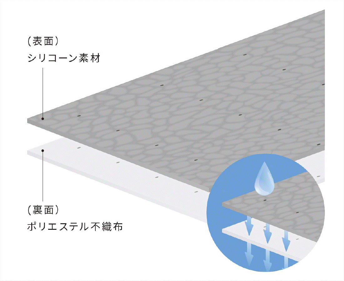 当商品は、シート裏面に、ポリエステル不織布を貼り合わせることにより、地面との緩衝材の役割を果たします。原料であるシリコーンの特長は、高い耐久性で品質維持に繋がり耐熱性も高く、高温でも燃焼しにくいため危険性は低く、総じて特性に変化がなく、耐寒性にも優れています。屋外に敷設しても柔らかく割れないため、品質変化がみられないことが大きな特長です。