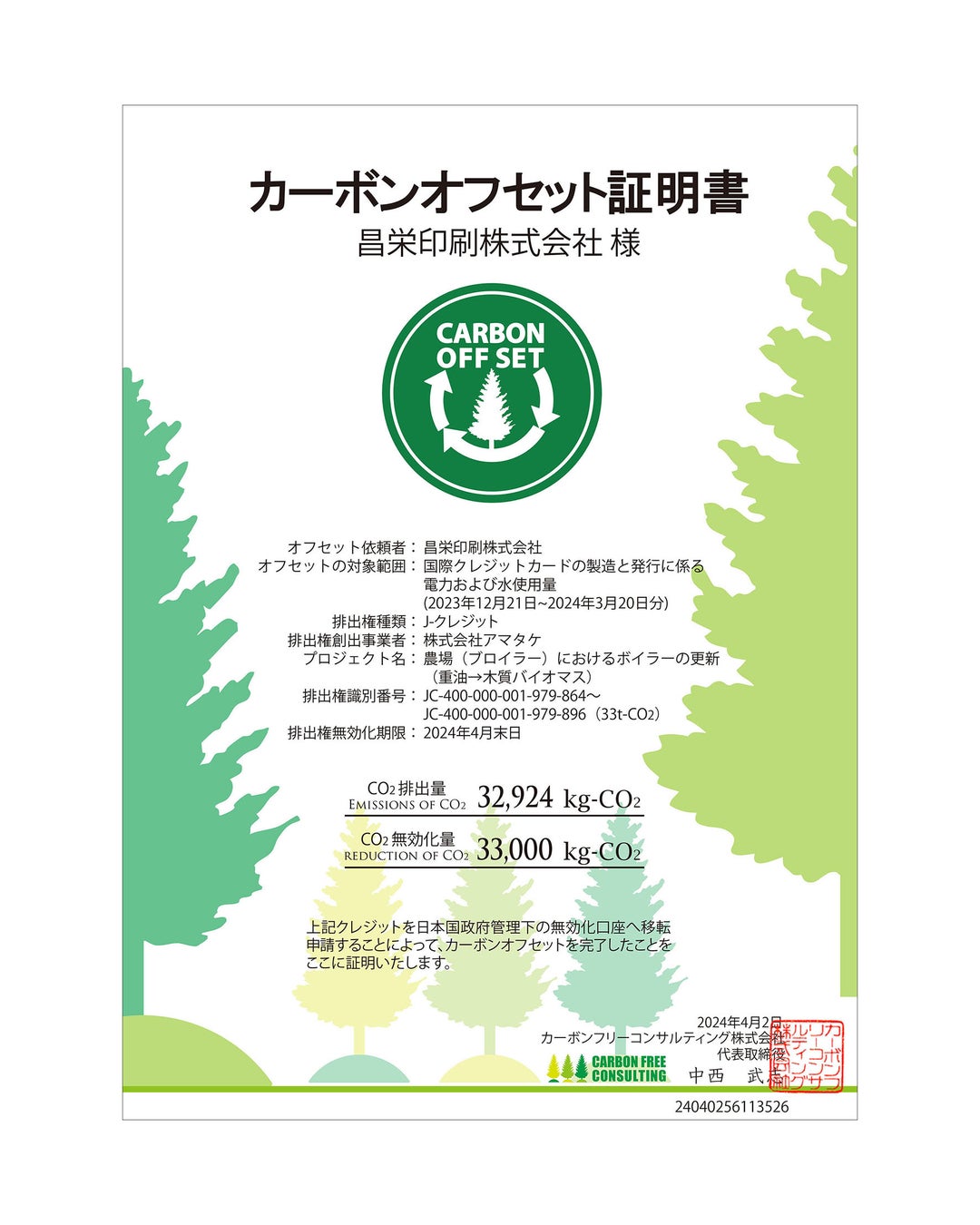 カーボンオフセット実行に伴う排出権の購入費用はすべて昌栄印刷が負担いたします。