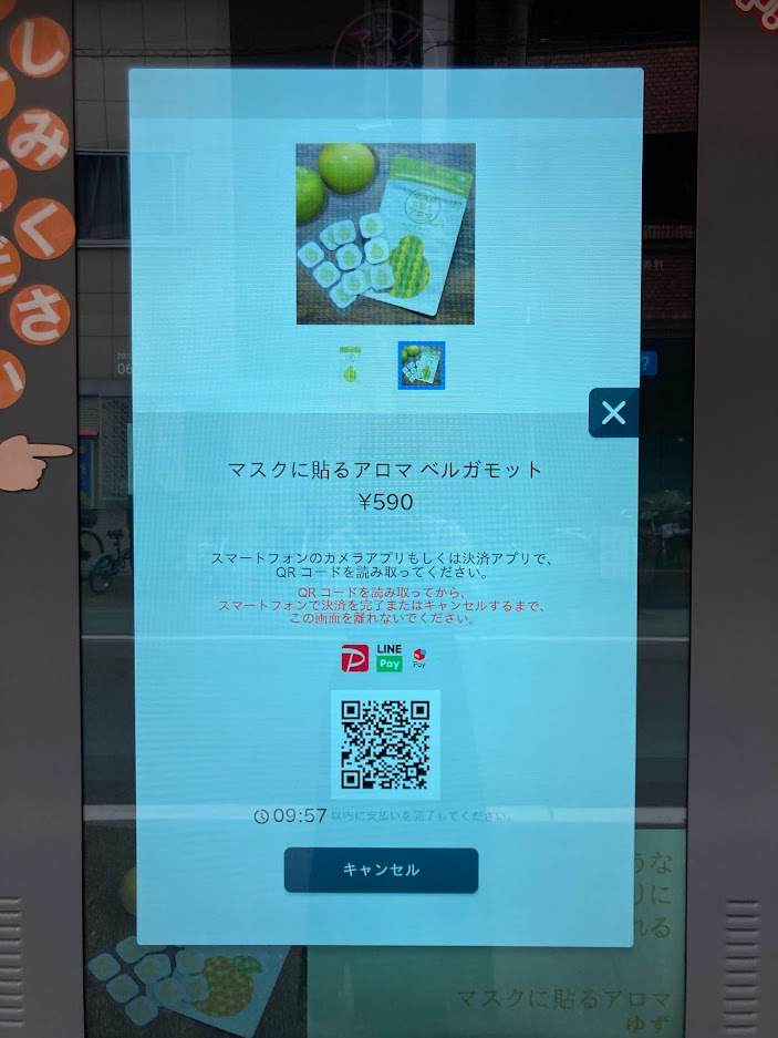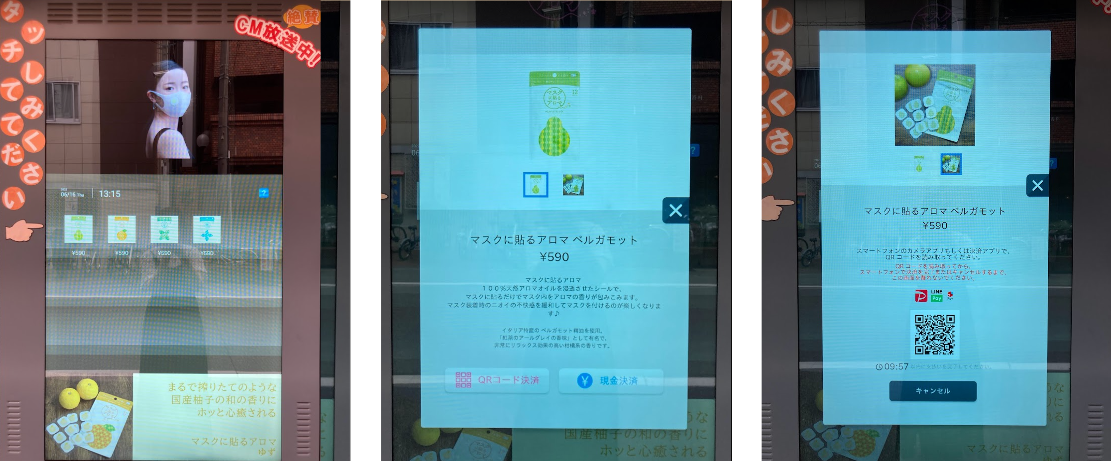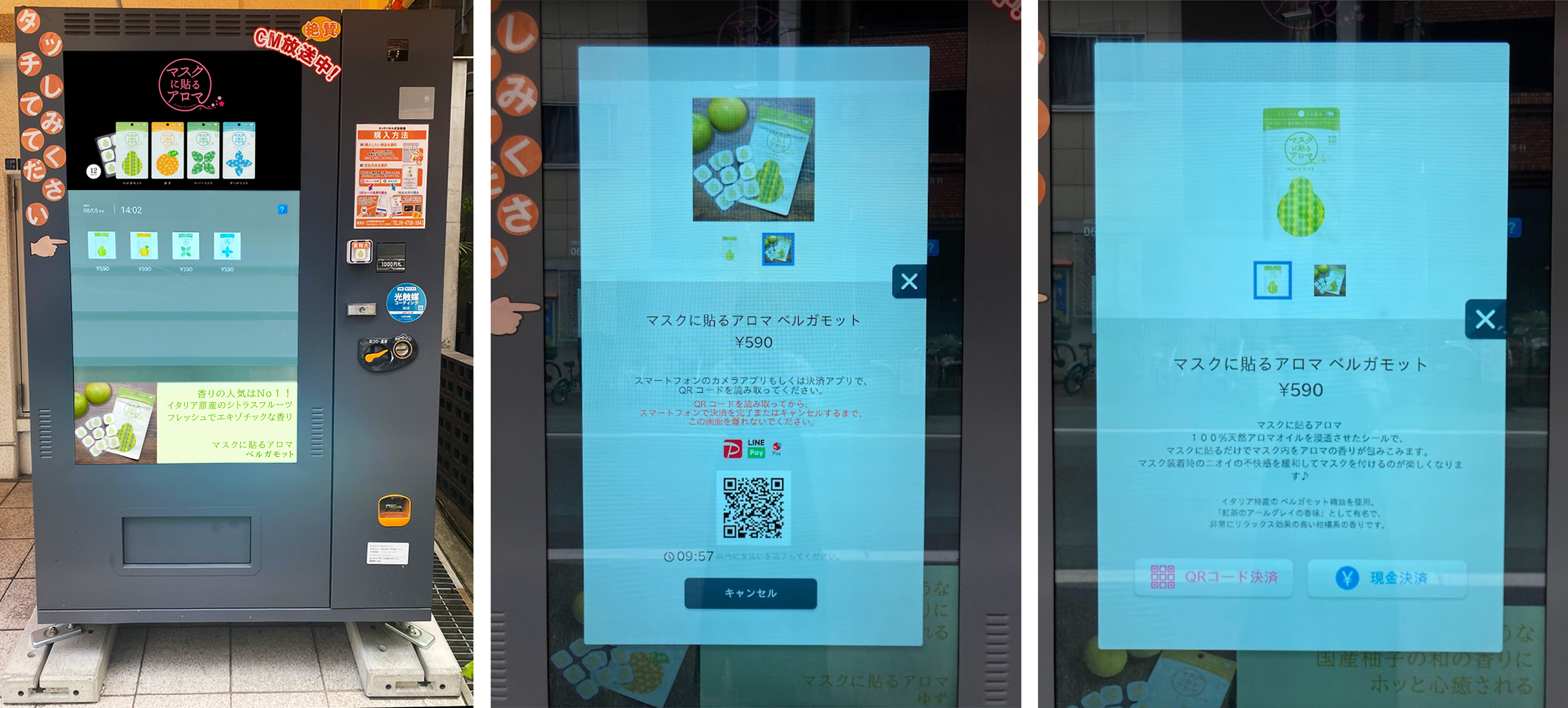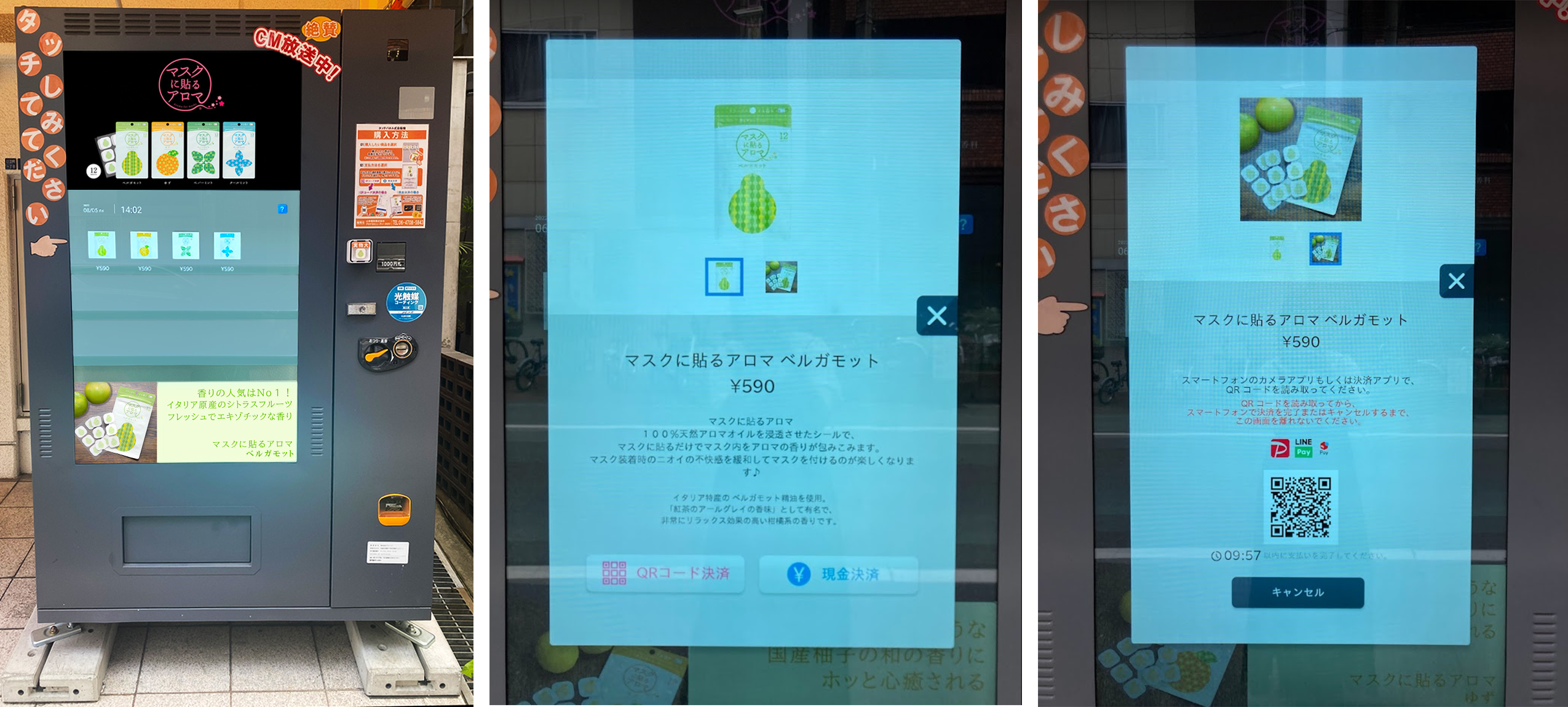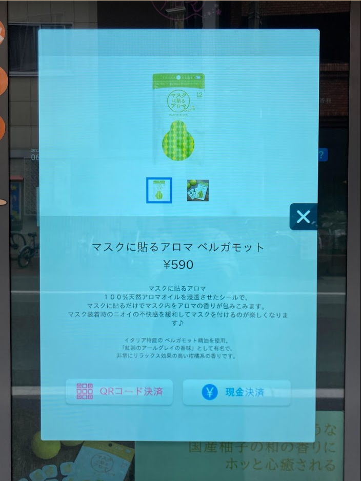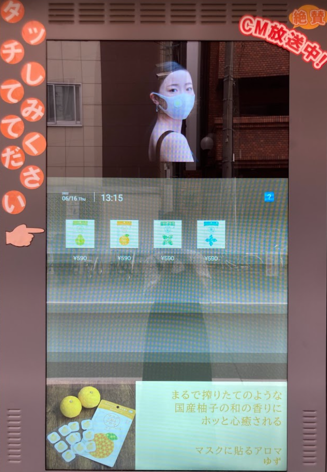 ABCテレビ・テレビ朝日系列 全国ネット「DAIGOも台所」ほか各所でCM放送中の「マスクに貼るアロマ」を手軽に購入できるタッチパネル式自動販売機が登場。