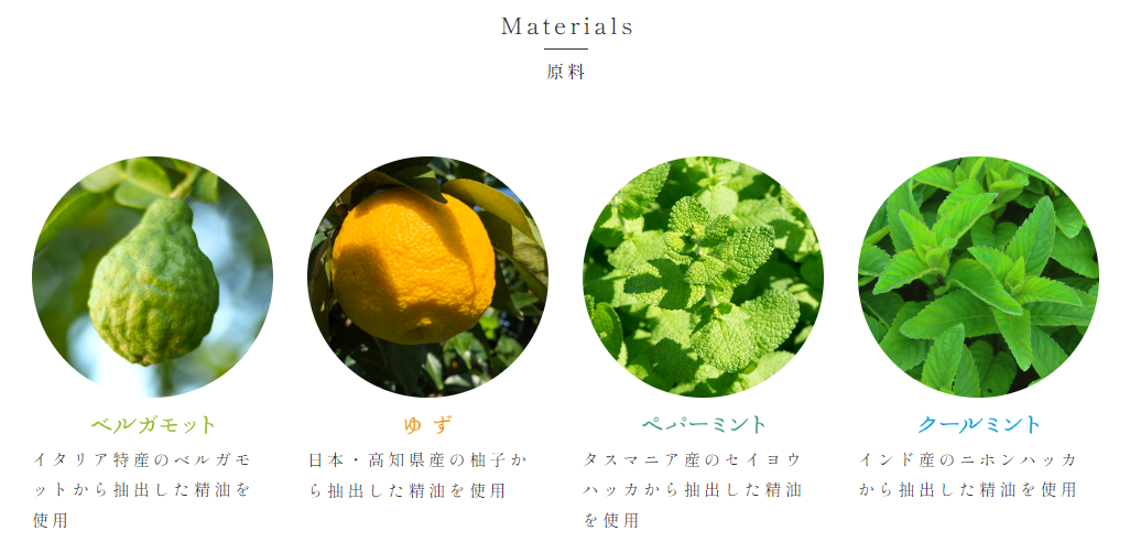 香りの種類:ベルガモット、ゆず、ペパーミント、クールミントの4種類。