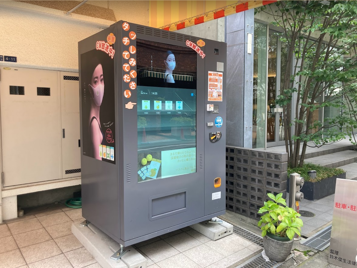 山本香料が大阪市中央区にテレビCM放送中の「マスクに貼るアロマ」タッチパネル式自動販売機を設置。