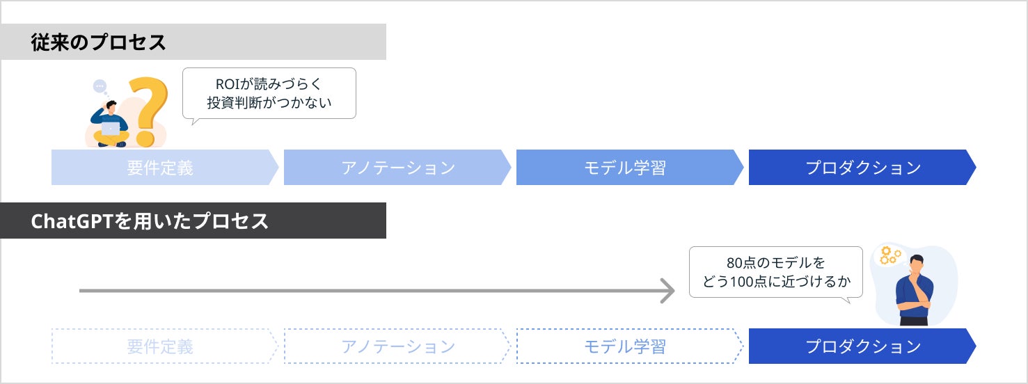 検証ハードルを大幅に下げることで、ある程度の有用性が見えてきた段階で本格的なAIへの投資判断を下せるようになるため、ビジネス的な課題が従来と比較すると格段に少なくなります。