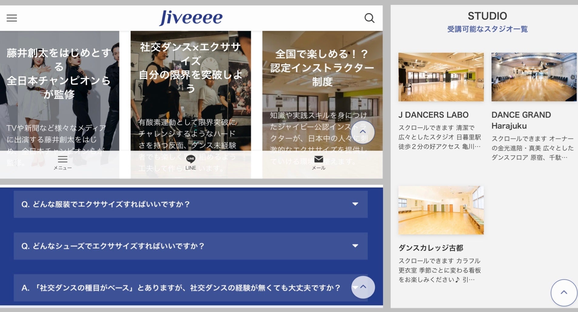 同サイトでは、ジャイビーの講座を開講しているダンススタジオ情報やインストラクター情報を掲載しており、ユーザーがジャイビー講座を受講する上で必要な情報を包括的に確認することができます。また、ジャイビープログラムの難易度やビビッ度(トレーニングの強度)を指標に自分に合ったプログラムを見つけることや定期的に公開される連載企画を楽しむことができます。