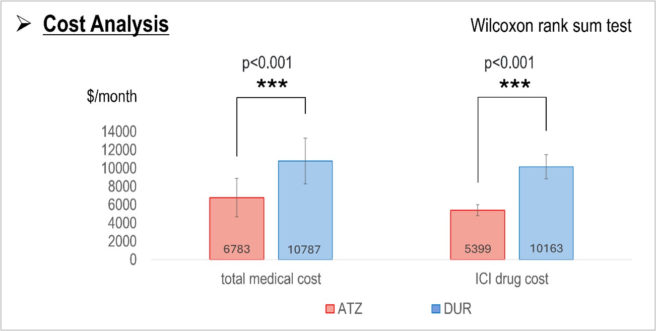 ICI治療期間中の1か月あたりの総医療費(平均値±標準偏差)は、ATZ-Gでは1,003,922±310,192円、DUR-Gでは1,596,511±371,405円でした(Wilcoxon順位和検定: P<0.001)。