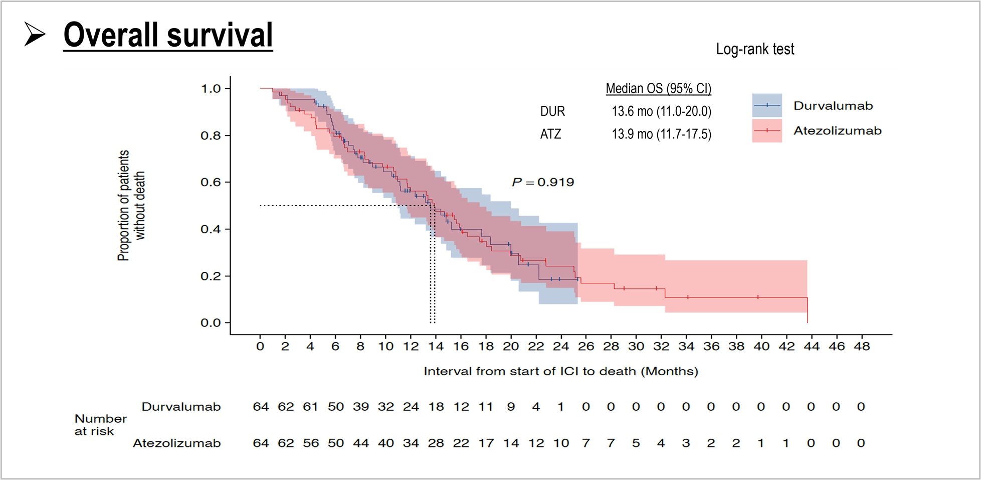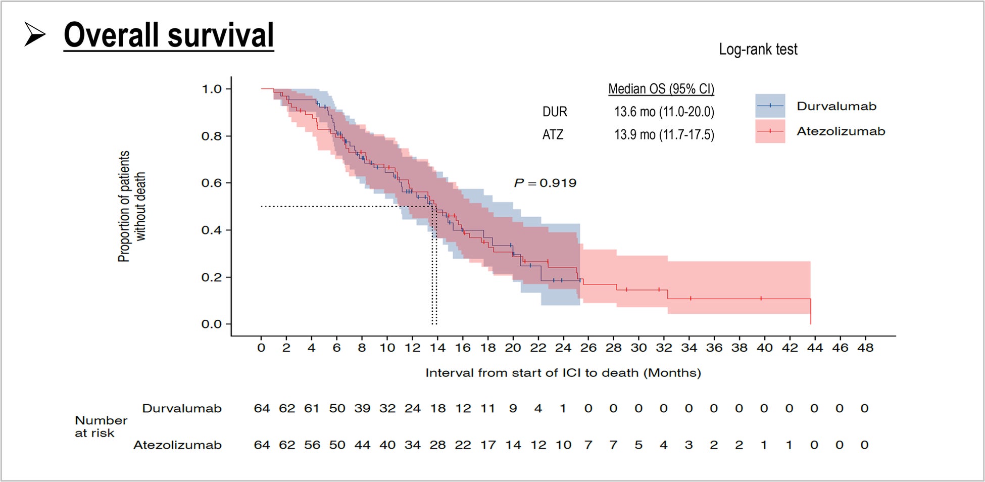 ATZ-G対DUR-GのOS中央値は、それぞれ13.9か月(95%信頼区間[CI]: 11.7-17.5)対13.6か月(95%CI: 11.0-20.0)でした(P=0.919)。COX比例ハザードモデルでは、PSの低下(ハザード比[HR]: 5.5、P<0.001)と骨転移(HR: 1.8、P=0.029)がOS短縮の重要な要因として特定されましたが、ATZとDURのICIの違いは要因として特定されませんでした。