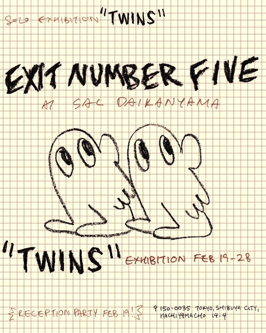 カナダのモントリオール出身で、現在は東京を拠点に活動するアーティストEXIT NUMBER FIVEが代官山のヘアサロンSALに併設されたSALOOM GALLERYにてソロエキシビジョンである“TWINS”を開催します。