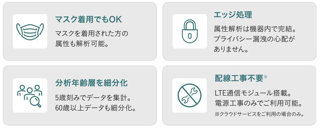 AIO-FX1では、人の認識から来店判定、さらに男女や年齢の推定までの一連の処理をセンサデバイス内で完結しています。外部サーバーでの解析は不要で、またセンサデバイスが出力・保存するのは解析結果としての男女・年齢層データのみです。特定の個人を識別する情報が取得・保存されることはありませんので、安心して分析データとしてご利用いただけます。