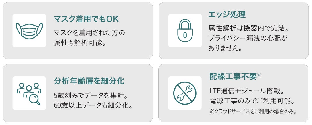 今回提供を開始する新たな来客属性分析サービス「男⼥年齢層分析システム・AIO-FX1」では、来店客数に加えて、男⼥・年齢層のデータ取得が可能になりました。