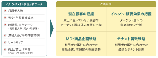 属性データを基にしたMD、ブランディングなどのマーケティング戦略や、テナント誘致、キーテナントの選定や店舗のリニューアル、改装などの施設、店舗戦略の意思決定を行うための基礎データとしてご活用いただけます。