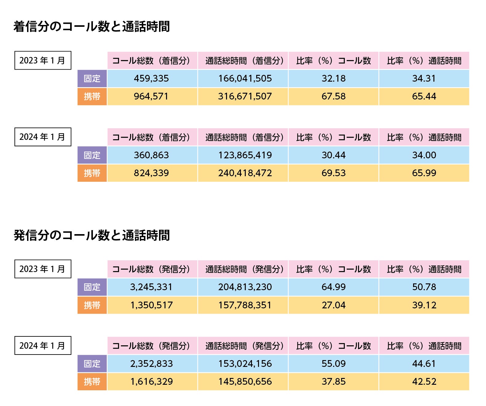 ・受信の通話時間の比率については、2023年から2024年1月のデータを比較した際に携帯からの受信が1%程度の増加が確認された。