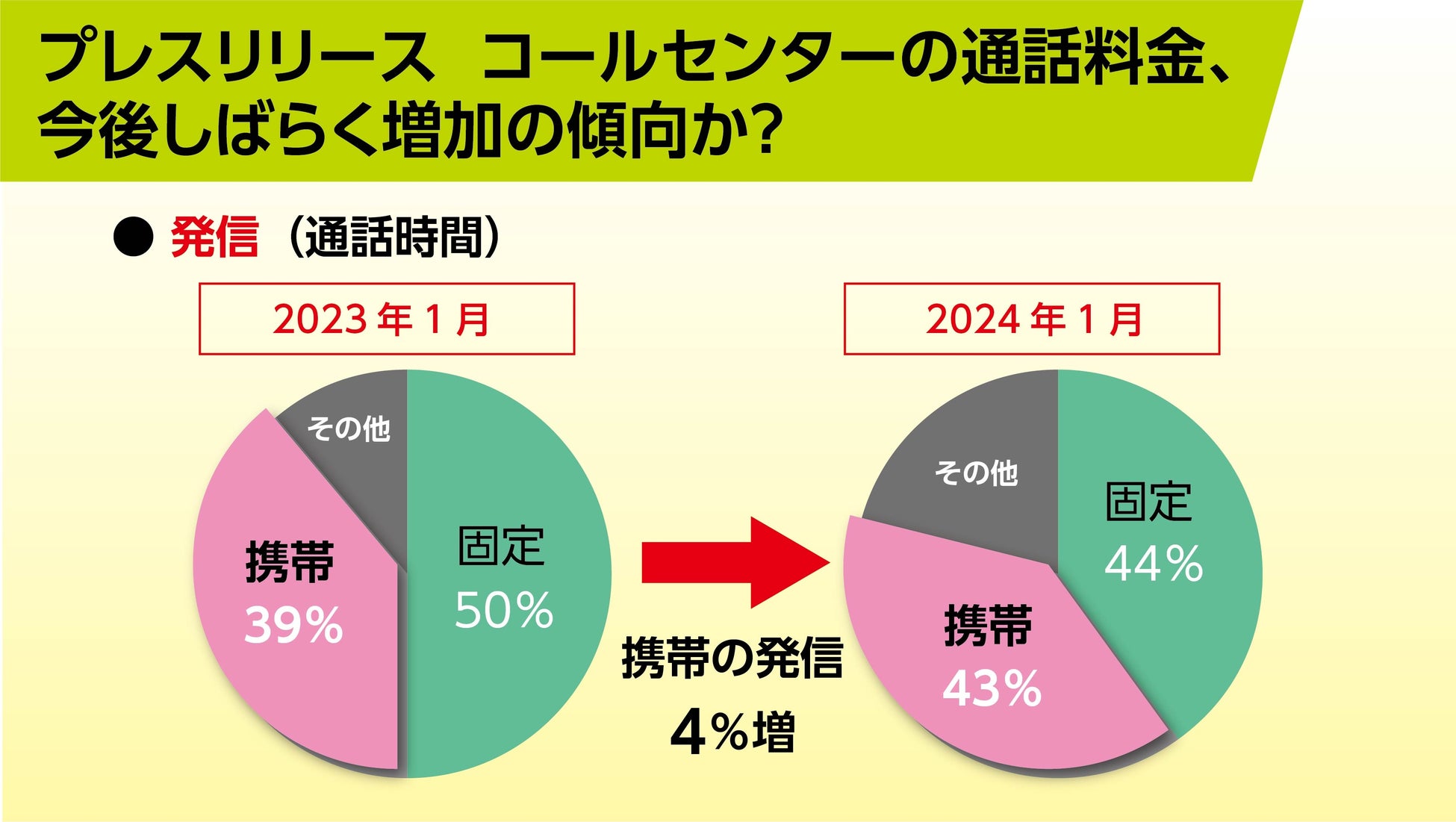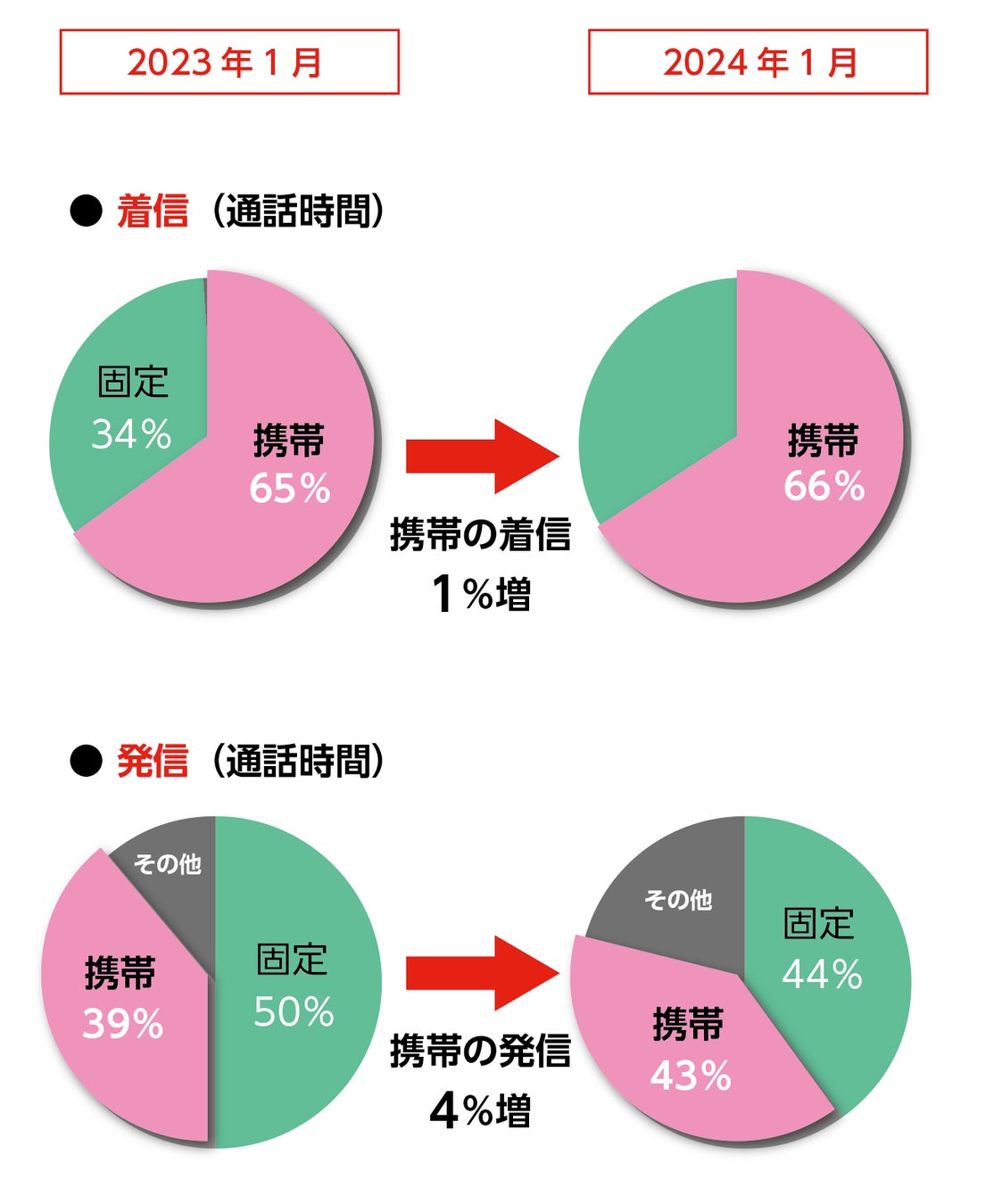 ・発信分の通話時間の比率については、2023年から2024年1月のデータを比較した際に携帯への発信が4%程度の増加が確認された。