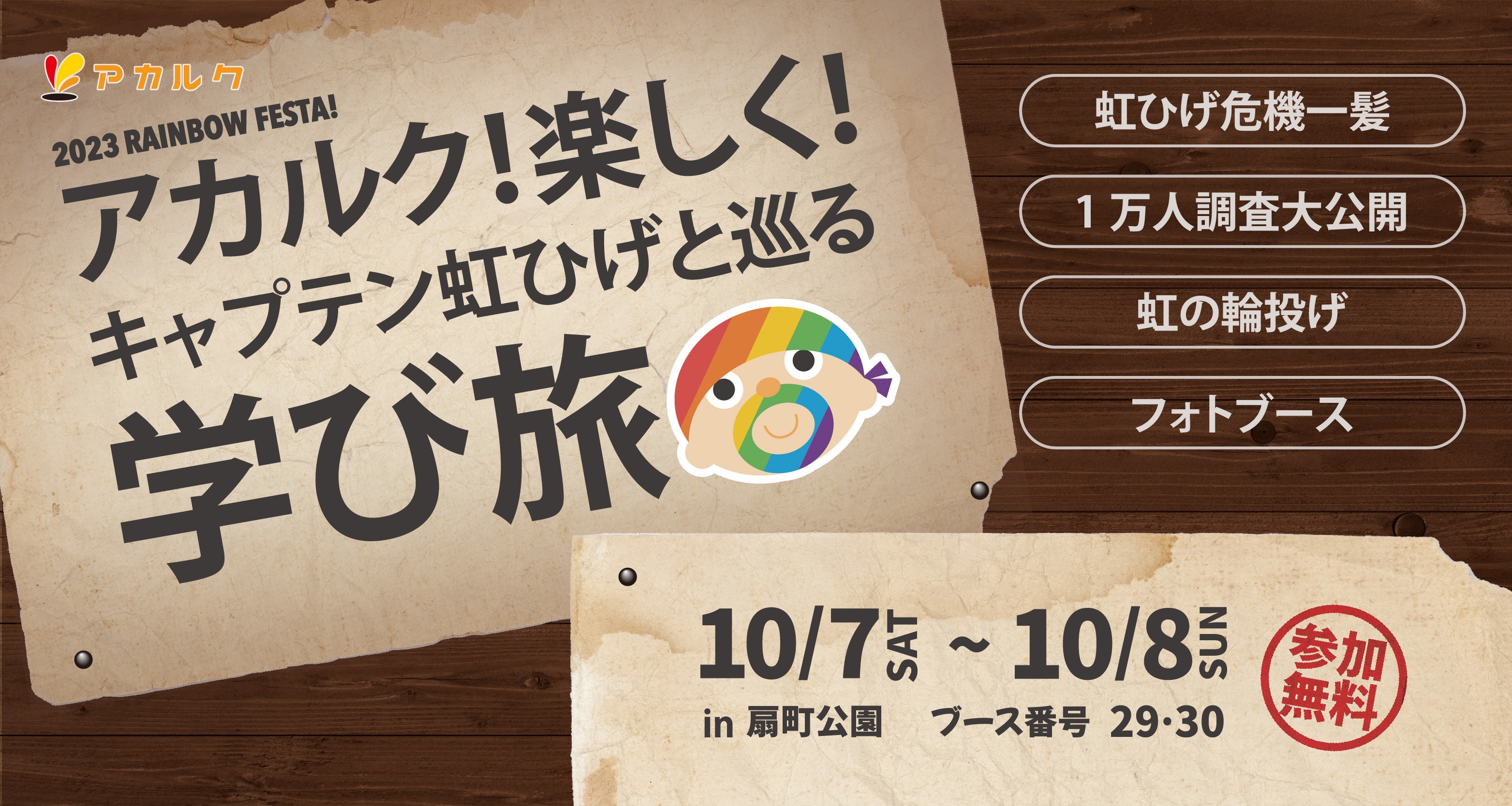 【10月7・8日】D&I推進を法人向けにサポートするアカルクが『アカルク!楽しく!キャプテン虹ひげと巡る学び旅』をレインボーフェスタ!2023へ出展〜「LGBTQ+に関する職場の実態調査」を同時公開〜
