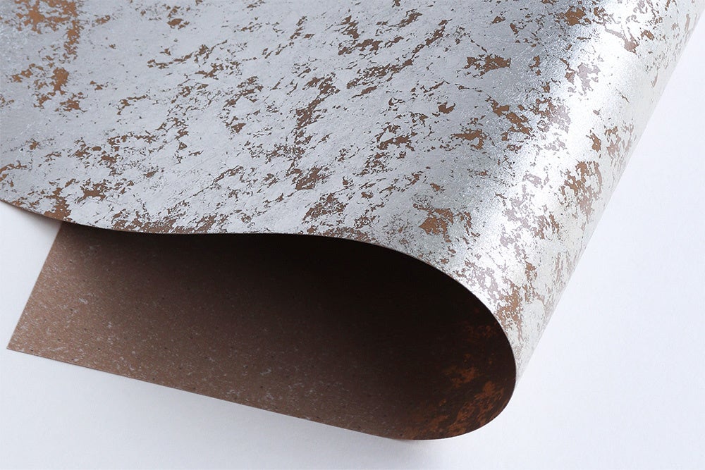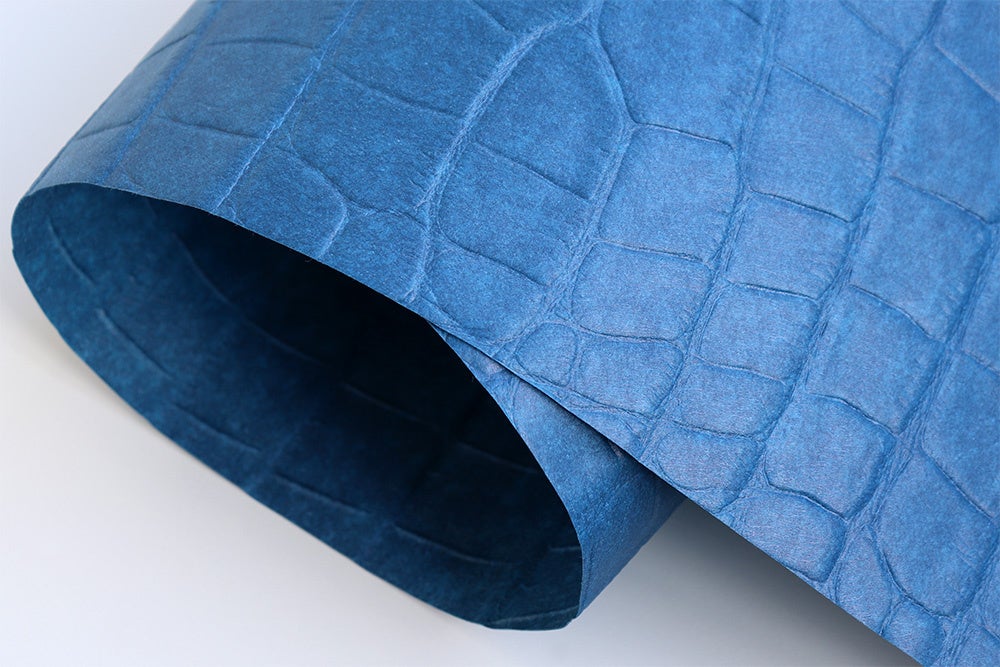 大直からは、再生ペットボトル繊維を和紙漉きの製法で生み出した素材「NAORON(ナオロン)」に、金銀の箔押しや、皮革のように見えるエンボス加工を施したものなど、アニマルフリー素材としてさまざまなプロダクトに活用可能な「NAORON+(ナオロンプラス)」の加工サンプルを展示します。