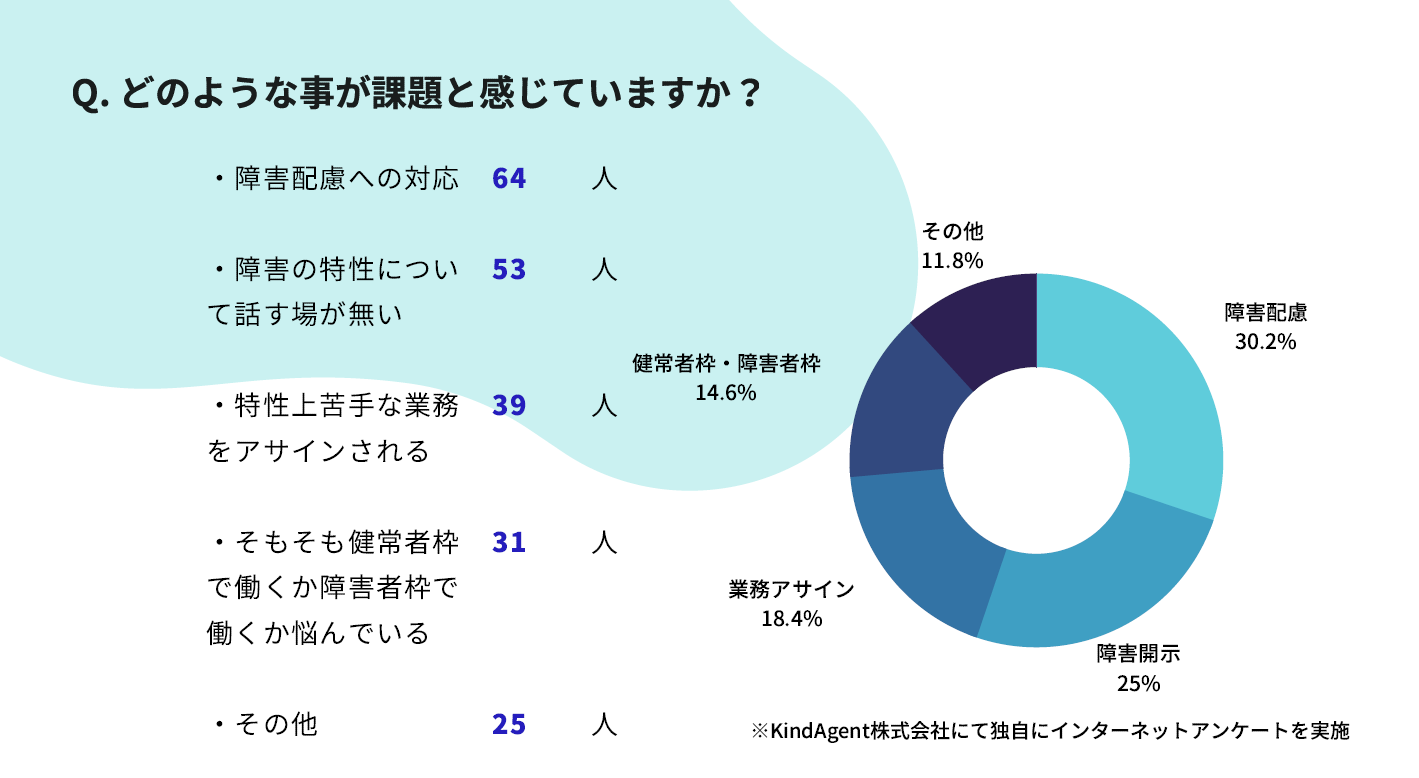 障害のある学生と言っても、全員が障害者雇用枠で働くわけではなく、健常者枠で就職する方も数多く存在します。そういった当事者の学生にとってインターンシップは会社や業務を知る良い機会ではありますが、現状では必ずしもそうならず、一定数の学生が健常者雇用枠・障害者雇用枠のどちらで働くかを決断出来ていないとの調査結果が判明しました。背景として、現状のインターンシップが1DAYや短期のプログラムが一般的であり、仕事上必要になるスキルを深く知る事や、「障害者雇用で働くとは」という事を肌で感じ理解する事等が出来にくい環境にあるという事が考えられます。