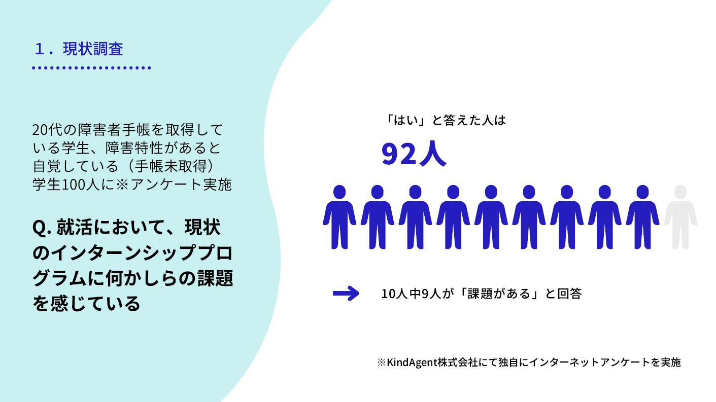 障害のある学生が新卒として就職する際、健常者枠・障害者雇用枠という働き方の実態を知らないまま就職し失敗してしまうケースを数多く目の当たりにしてきた事から、日本全国の大学に在籍する障害のある学生、100人に「障害のある学生の就職活動アンケート」を実施。その結果としておよそ9割の障害のある学生が現状のインターンシッププログラムに課題があると回答しました。