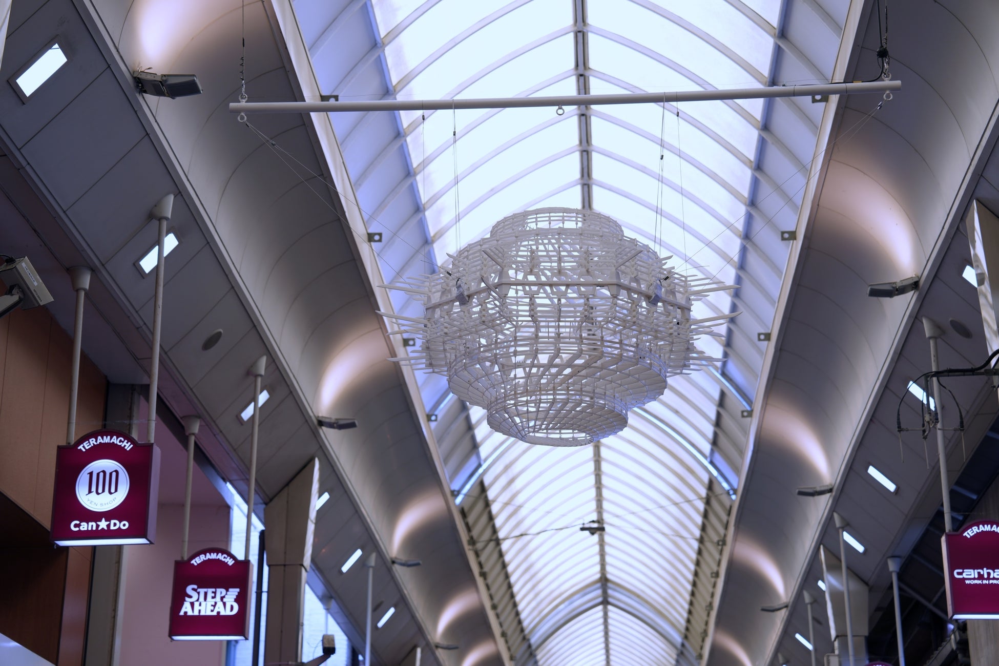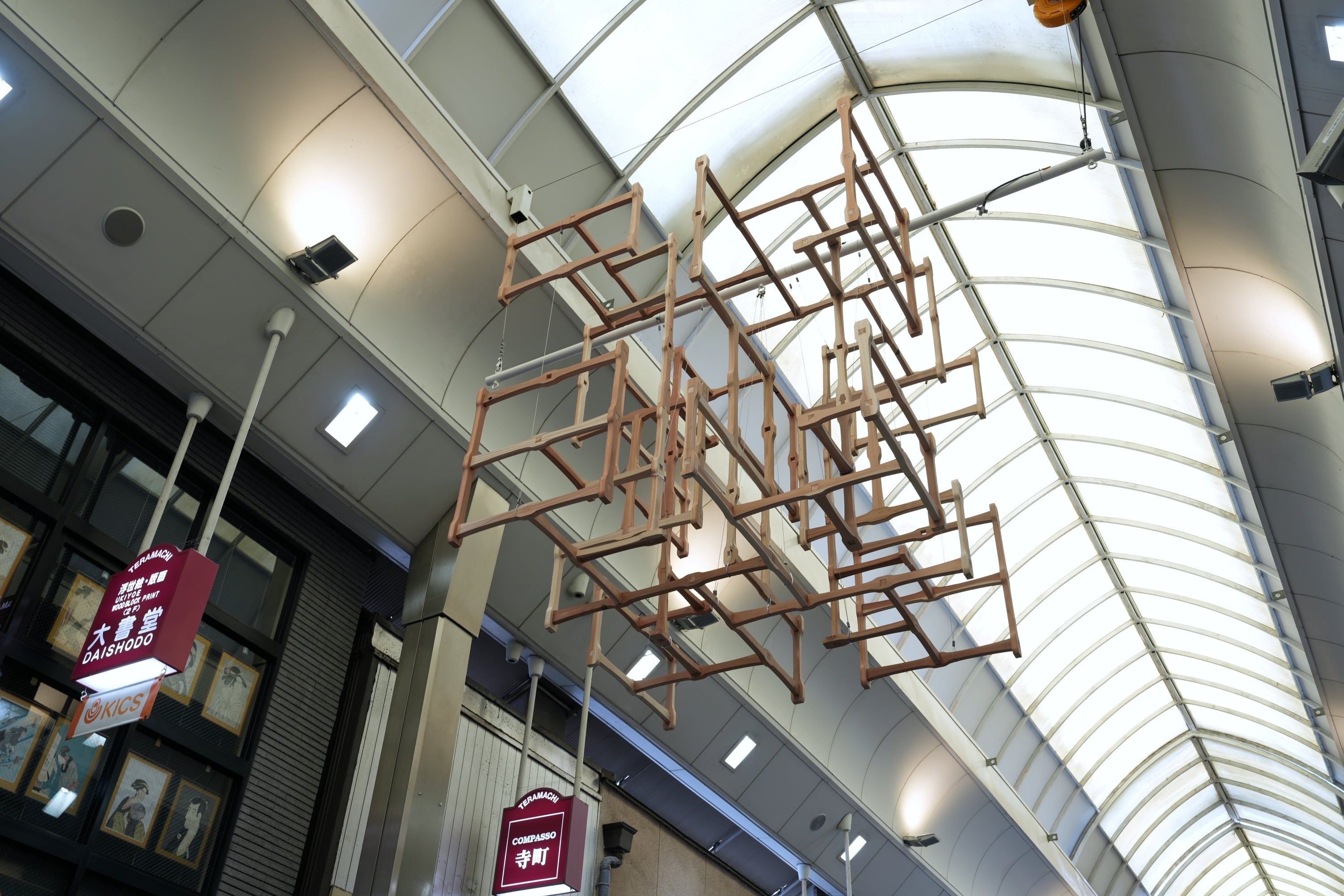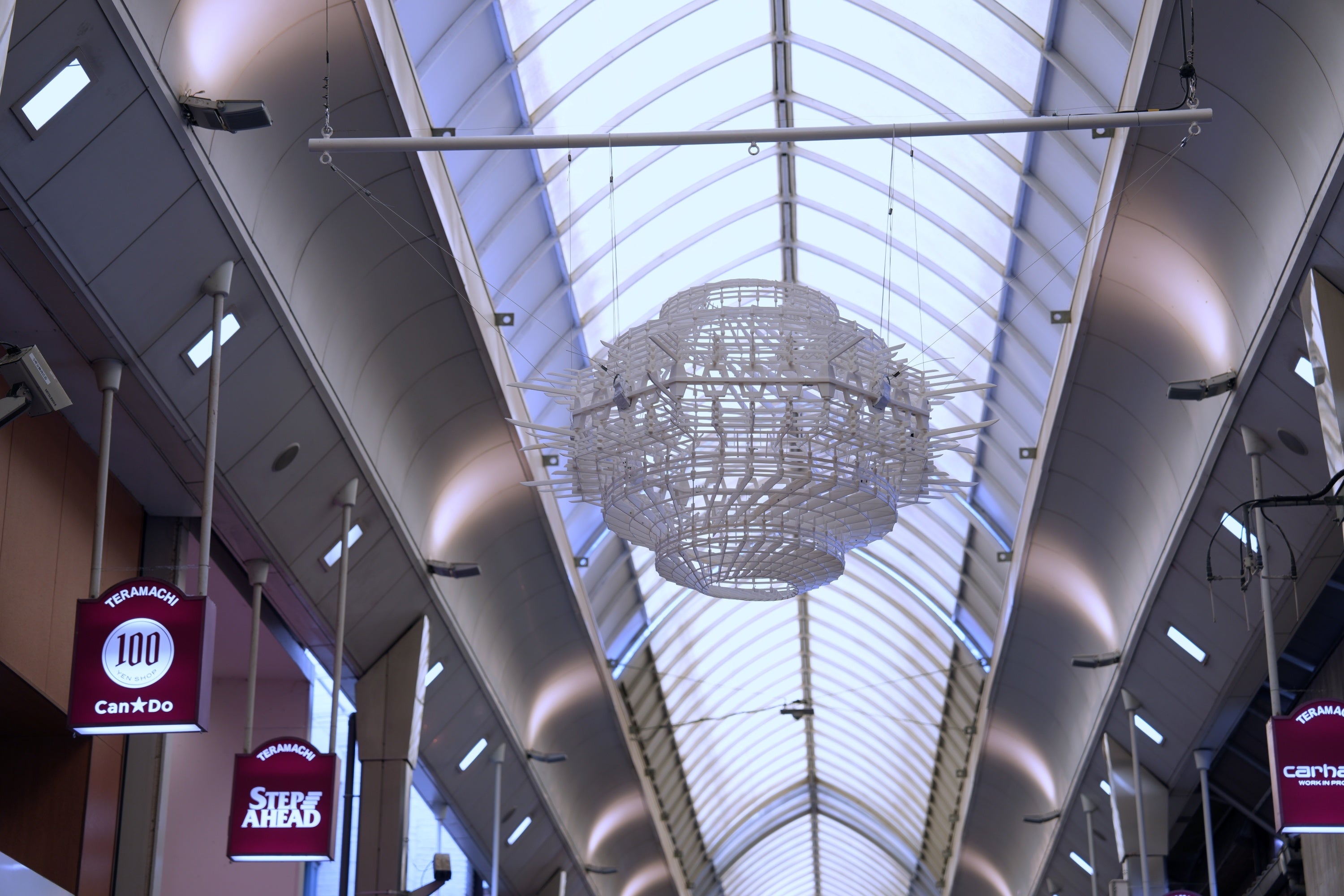 「寺町京極|商店街美術館」は、商店街が美術館になり、たくさんの人がアートに触れ、日常生活と文化・芸術がつながり合える場所を目指したアートプロジェクトです。2022年12月1日(火)から、ことくらす合同会社のコーディネートにより、職人や学生、地域団体が制作する様々なアート作品をアーケードに吊り下げ、展示を行っています。