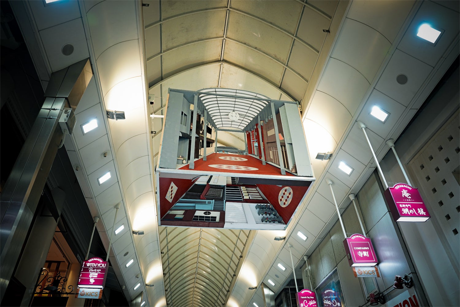2023年10月3日(火)よりスタートした第4弾「寺町京極|商店街美術館・学生コラボレーション展 2023」では、公募により選ばれた学生アーティスト作品を商店街のアーケードに吊り下げ、展示を行っています。