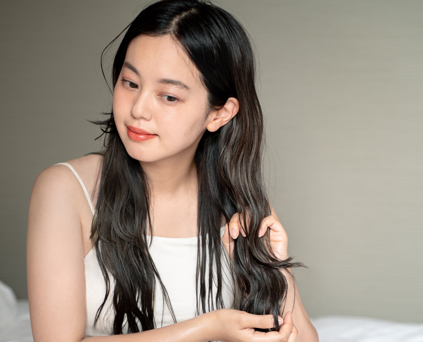 髪の毛先やダメージが気になる部分を中心に、もみこむようにやさしくなじませまることで、まとまりのあるツヤ髪に導きます。仕上げに、手に残ったオイルで髪を軽くなで、シルエットをととのえると髪表面にツヤがでます。
