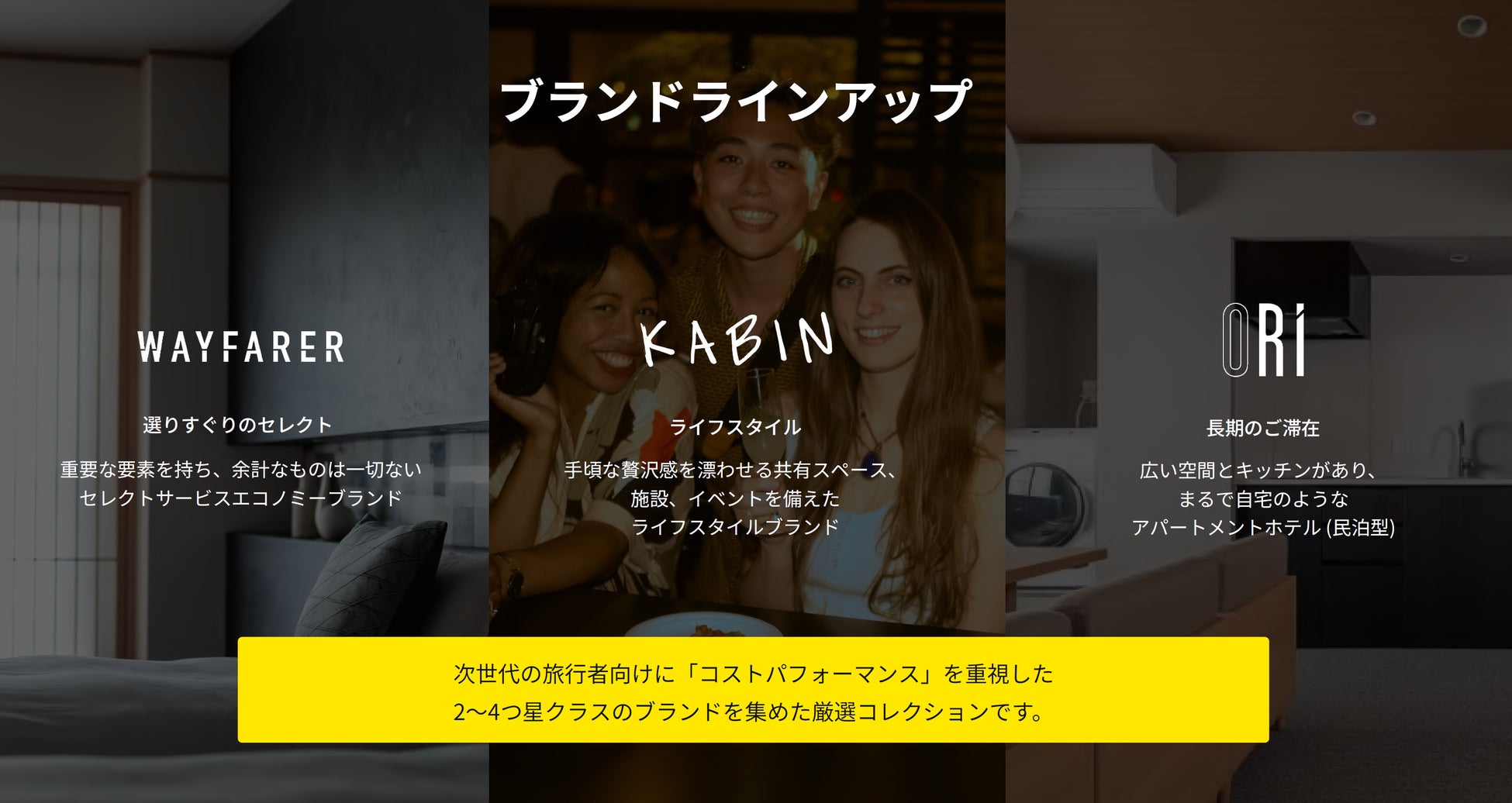 2019年からプラットフォーム「Kabin」のもと、私たちは急速に13の宿泊施設を展開してきました。「Powered by Kabin」というスローガンのもと、3つの個性豊かなブランドを展開しています。