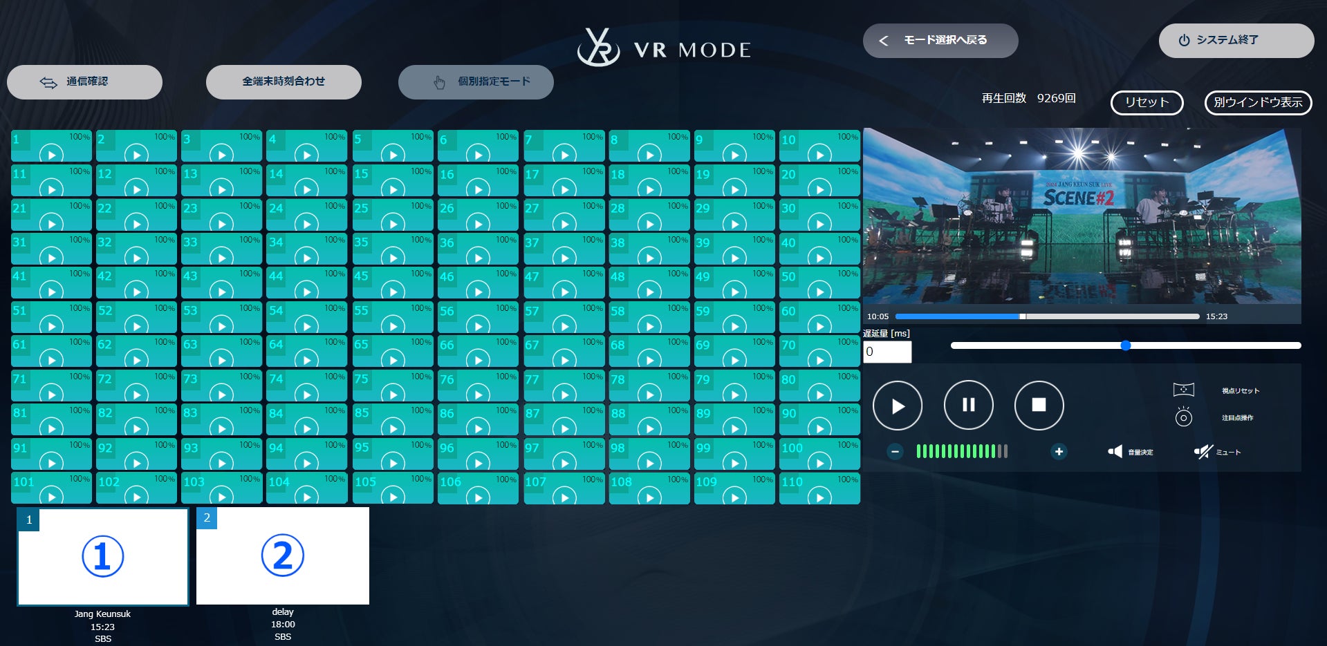当社の業務提携先である、株式会社クロスデバイスが開発したVR映像同時再生システム「ALL START」を採用。通常、VR映像を体験いただく場合は、個々のヘッドマウントディスプレイ(HMD)を操作する必要がありますが、本システムを使用すれば、PCの再生ボタンを押すだけで、HMDを一斉に再生させる事が可能です。