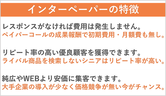 A.そうですね。多いと思います。ただ肌感覚としては、全国紙の新聞広告に定額で出稿していた頃よりは、若干若返っている感じはします。インターペーパーからのお客様の方が、一年に複数回買っていただくなど、アクティブに動いていただける方が多い気がします。
