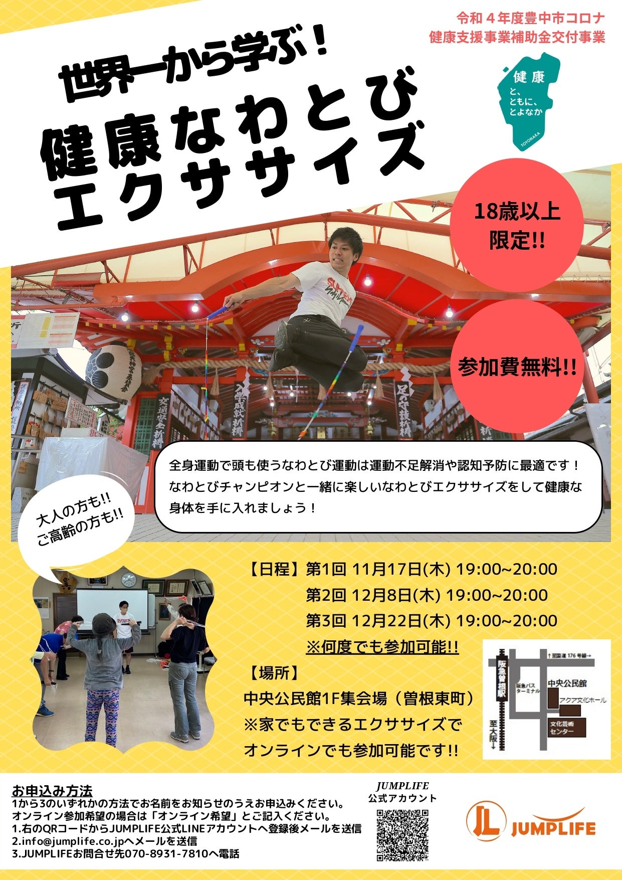 株式会社JUMPLIFE(代表取締役社長:黒野寛馬、所在地:大阪府豊中市)は、大人を対象にしたなわとびエクササイズを2022年11月17日(木)、12月8日(木)、12月22日(木)の計3回開催します。コロナ禍で運動不足に陥っている方や足腰を強化したい方、ダイエットをしたい方など大人に特化したエクササイズを現役なわとび世界チャンピオンがサポートしていきます。URL:https://jumplife.co.jp/