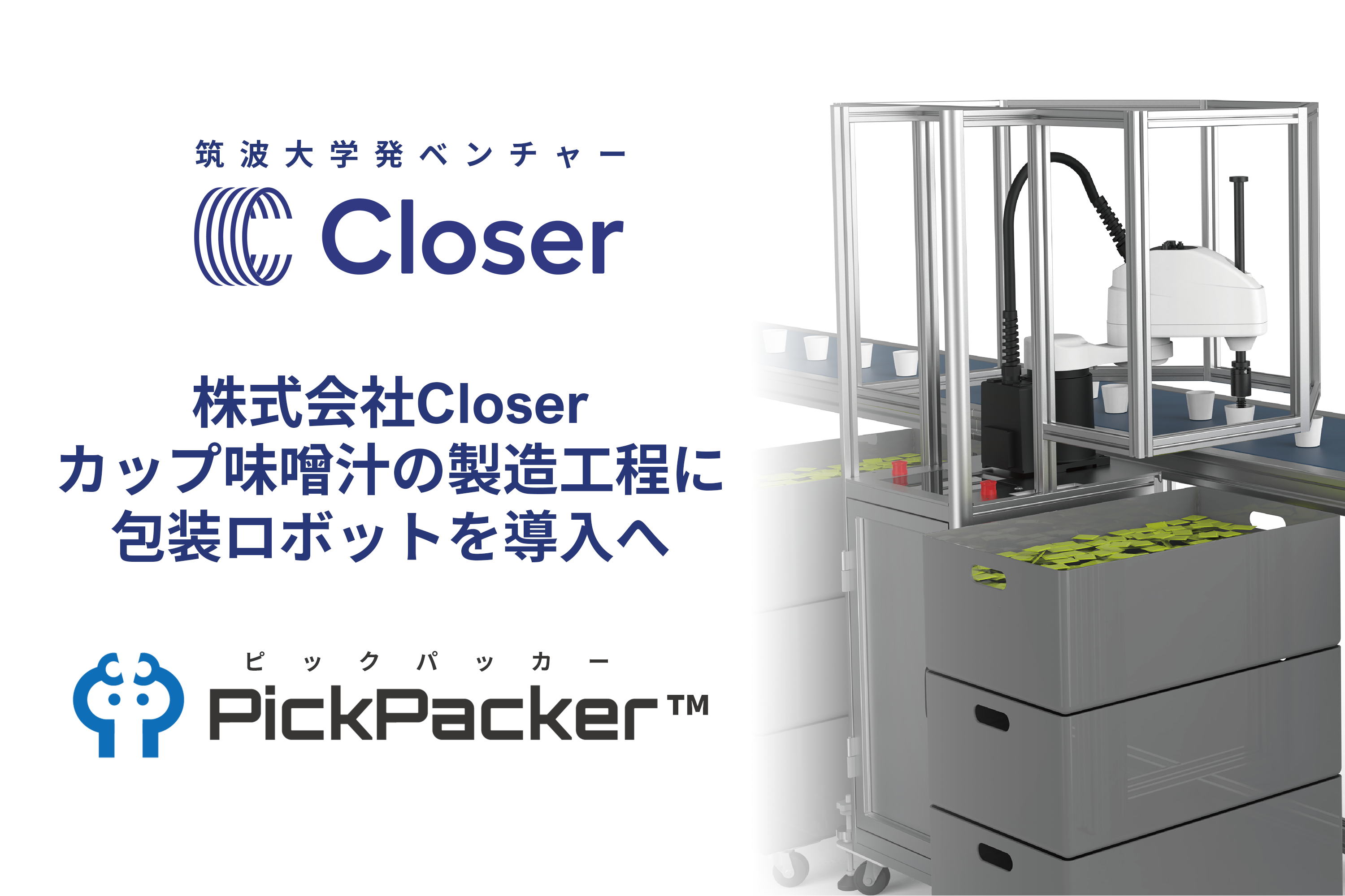 ロボティクス技術で自動化が進まない産業に革新を起こすことをミッションとする、筑波大学発ベンチャー株式会社Closer(本社:茨城県つくば市、代表取締役:樋口翔太)は、カップ味噌汁の製造工程にピッキングロボット「PickPacker™(ピックパッカー)」の導入開始が決定し、開発を進めています。