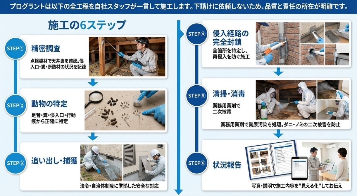 プログラントは以下の全工程を自社スタッフが一貫して施工します。下請けに依頼しないため、品質と責任の所在が明確です。