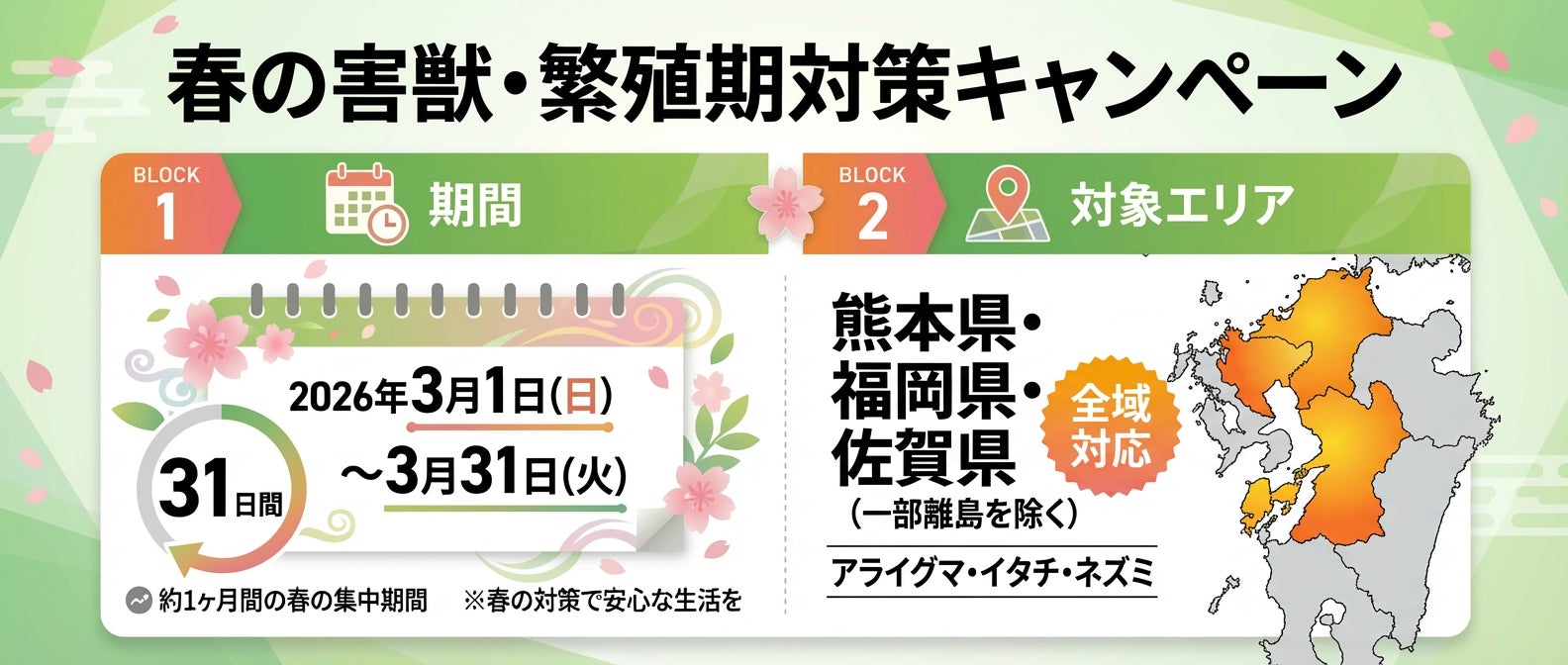2026年3月1日〜3月31日、熊本県・佐賀県・福岡県全域で無料精密調査を実施。最長10年の侵入防止保証付き。西日本新聞・日経新聞に掲載された害獣駆除専門企業が、繁殖期前の早期対策を呼びかけ