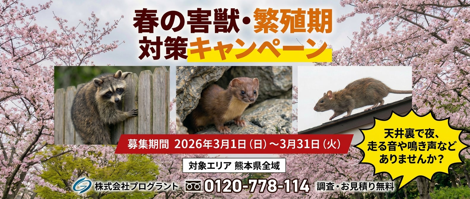 熊本県でアライグマ駆除・イタチ駆除・ネズミ駆除を手がける害獣駆除専門企業の株式会社プログラント(本社:熊本市北区、代表取締役:藤井 靖光)は、2026年3月1日より、「春の害獣・繁殖期対策キャンペーン」を熊本県の全域で開始します。是非この機会に害獣被害が拡大する前の対策を行いましょう。