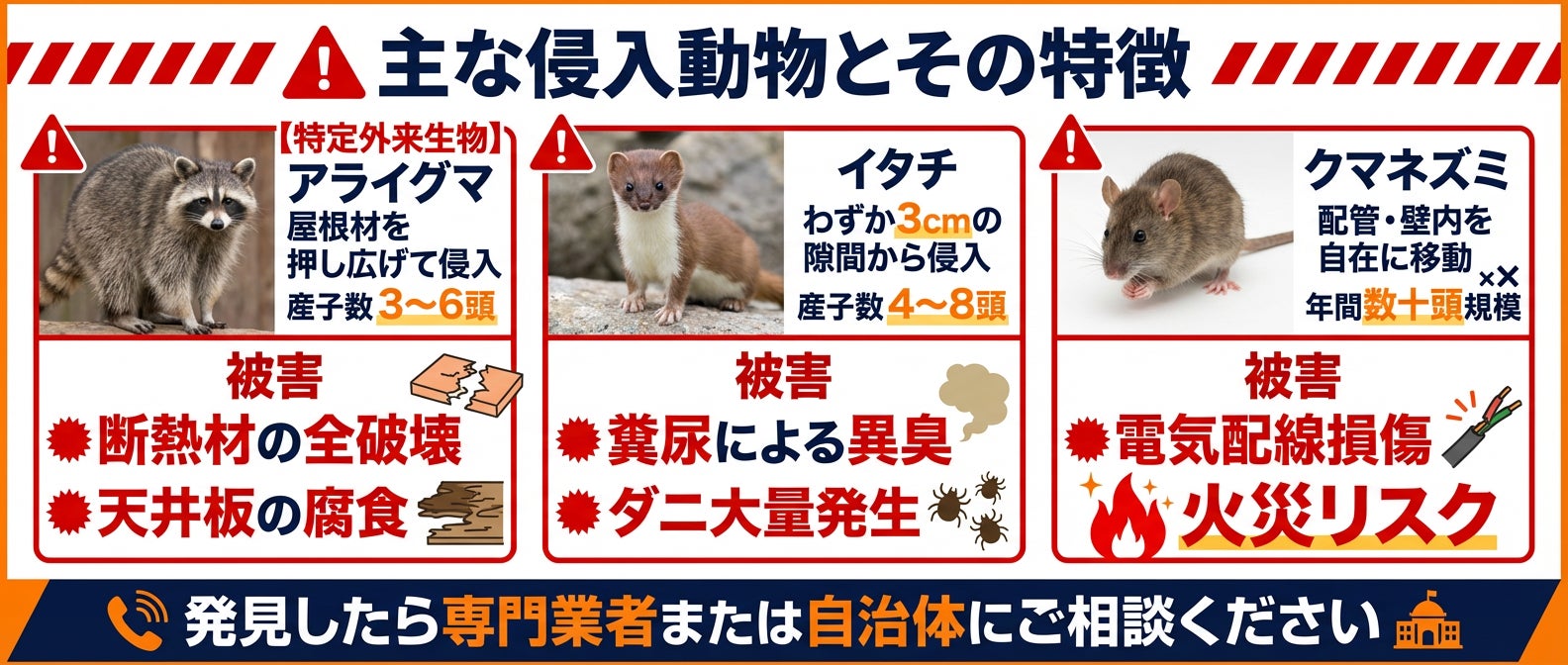動物侵入の特徴産子数主な被害アライグマ特定外来生物。屋根材を押し広げて侵入3〜6頭断熱材の全破壊・天井板の腐食イタチわずか3cmの隙間から侵入4〜8頭糞尿による異臭・ダニ大量発生クマネズミ配管・壁内を自在に移動年間数十頭規模電気配線の損傷による火災リスク