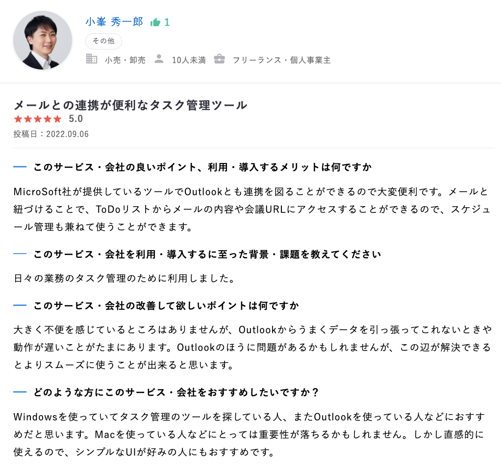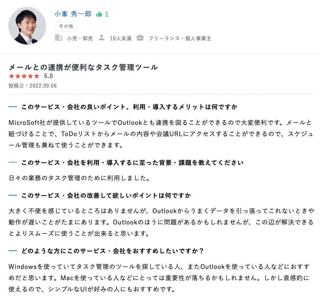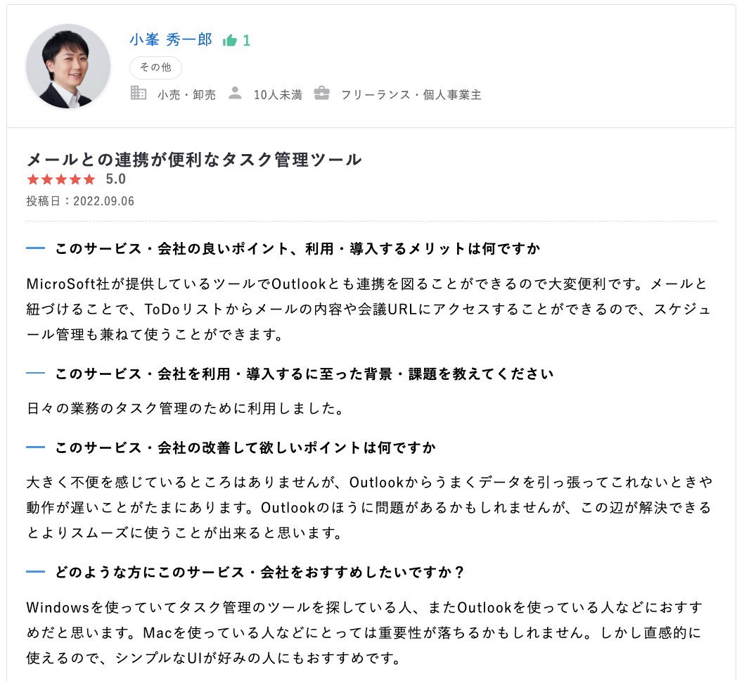 他のサービスと連携できる点やMicrosoft To Doの利用に向いている媒体の種類など、参考になるレビューです。