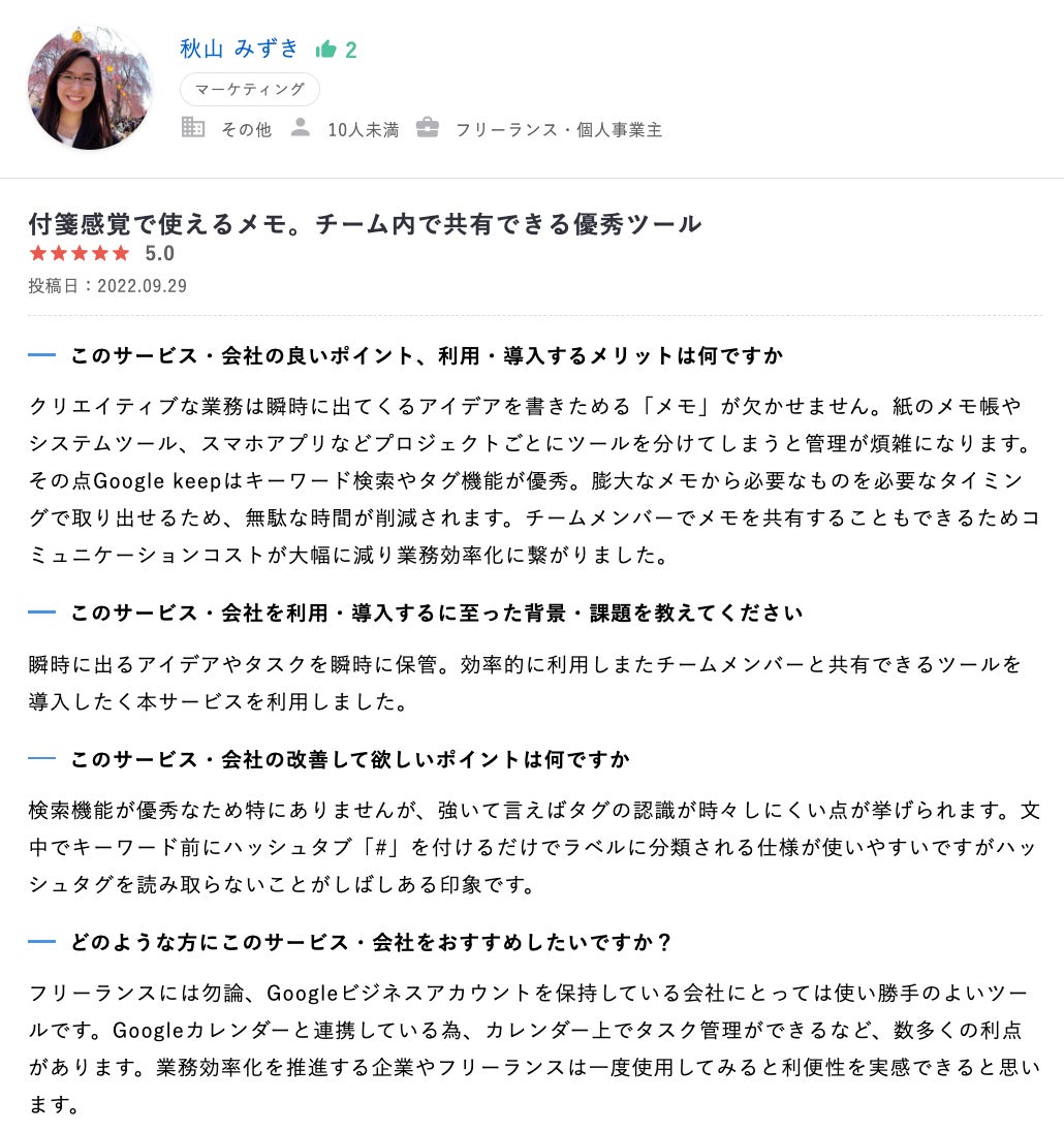 アナログの管理で欠かせなかった付箋のように使えるという魅力と、同じGoogleの他サービスと連携して管理できるところも高く評価されているレビューです。