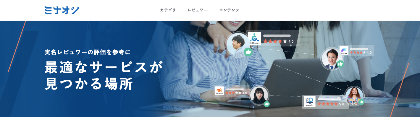 法人リードジェネレーションサービス「ミナオシ(https://3naoshi.com/)」は、法人に必要なサービス、企業、プロダクトを部門別で絞り込み検索したり同じ業種・部門のユーザーたちの「利用したサービス」や「実名制レビュー」を参考に最適なサービスが見つかるサイトです。