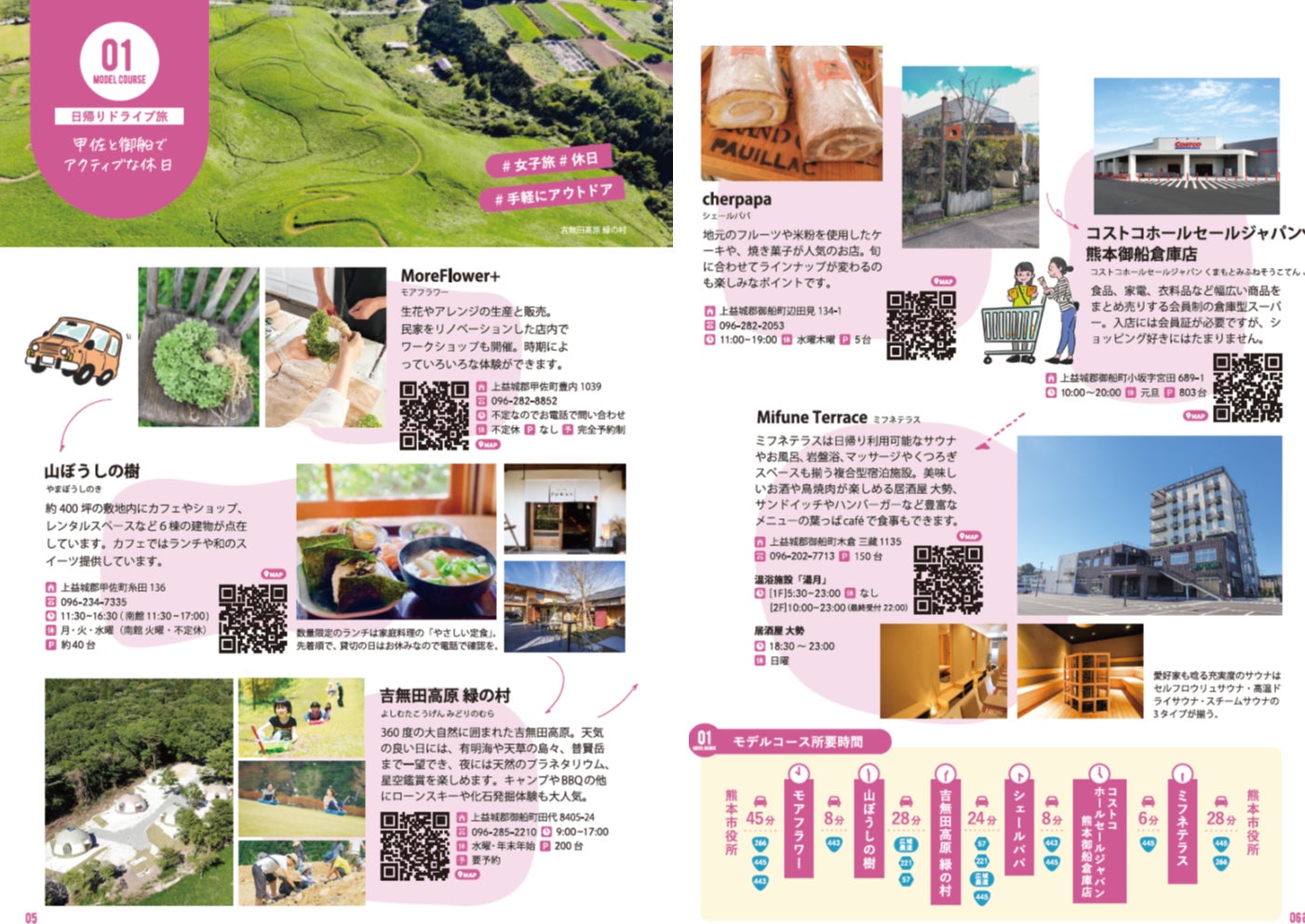 今回制作した緑川流域周遊パンフレットでは、アウトドア施設やアウトドアアクティビティ等を体験できるスポットだけでなく、各町の名産品や名物、観光スポットも堪能できる、緑川流域4町を巡る4つのモデルコースを紹介しています。
