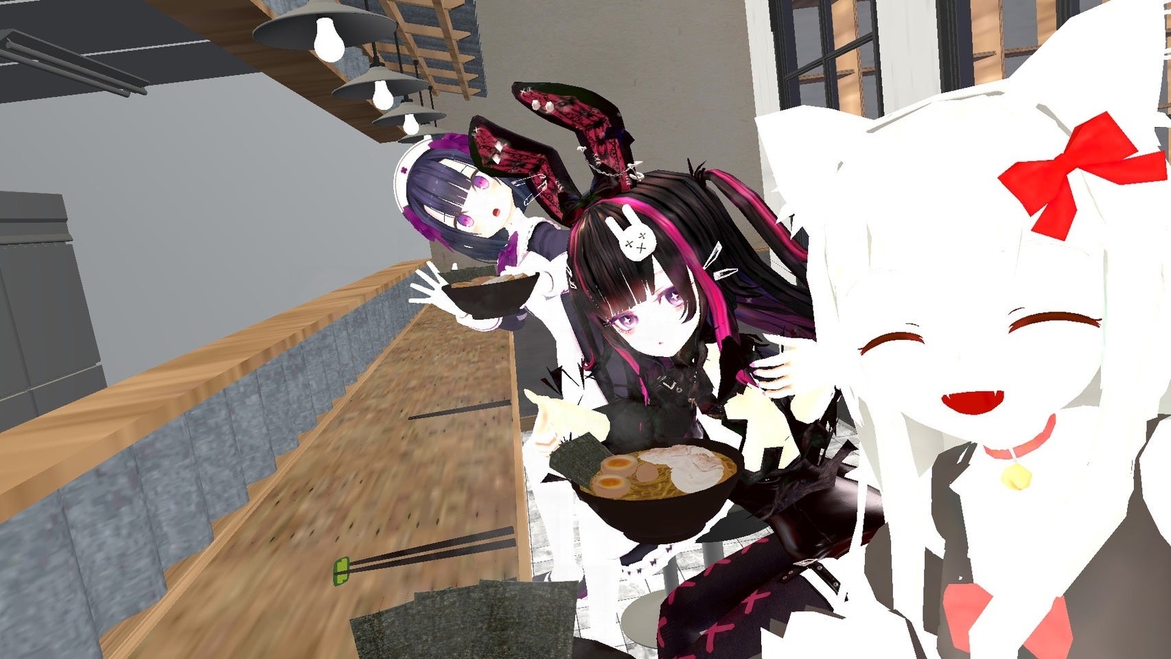 ・ラーメン店を模したミーティングにも使えるカウンターテーブルを設置してあります。メタバースでは他の人の話す声の聞こえる範囲を設定することもできるので、パーソナルスペースやチームビルディング等の目的に合わせた空間設計が可能になりました。