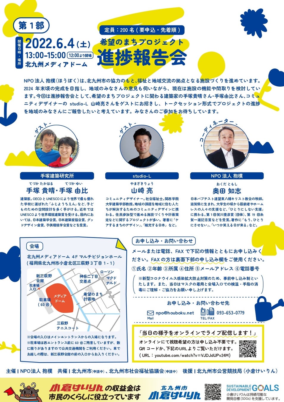 第1部のトークイベントの様子は、抱樸のyoutube配信「ほうぼくチャンネル」で中継する予定です。 当日会場に来られない方も是非ご視聴ください。 ほうぼくチャンネル: https://www.youtube.com/channel/UCgRCvmRHJVIvv254i19rNWw |