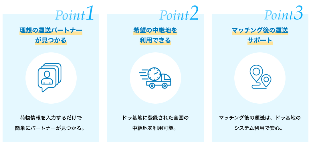 ドラ基地は、長距離運送を行っている運送会社同士のマッチングからマッチング後の運送補助までシステムでサポートする今までにない新しいサービスです。長距離運送で必要となる中継地は全国37拠点あり、最適な中継地を提供可能!ドラ基地を利用すると理想の運送パートナーを見つけることができ、現状の様々な長距離運送の課題解決に繋がる革新的サービスです。「労働環境の改善を図りたい」「法改正や物価高で今後運送の継続が困難」「中継、物流拠点を探すのが困難」このよなお困りごとはドラ基地が救世主として解決します!